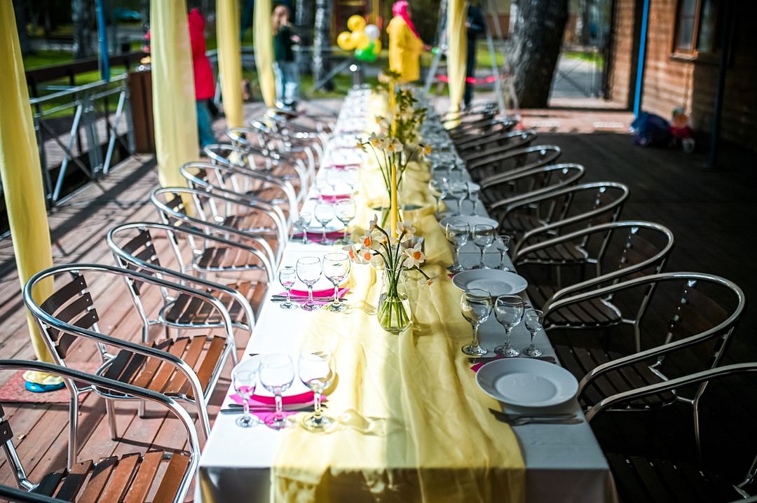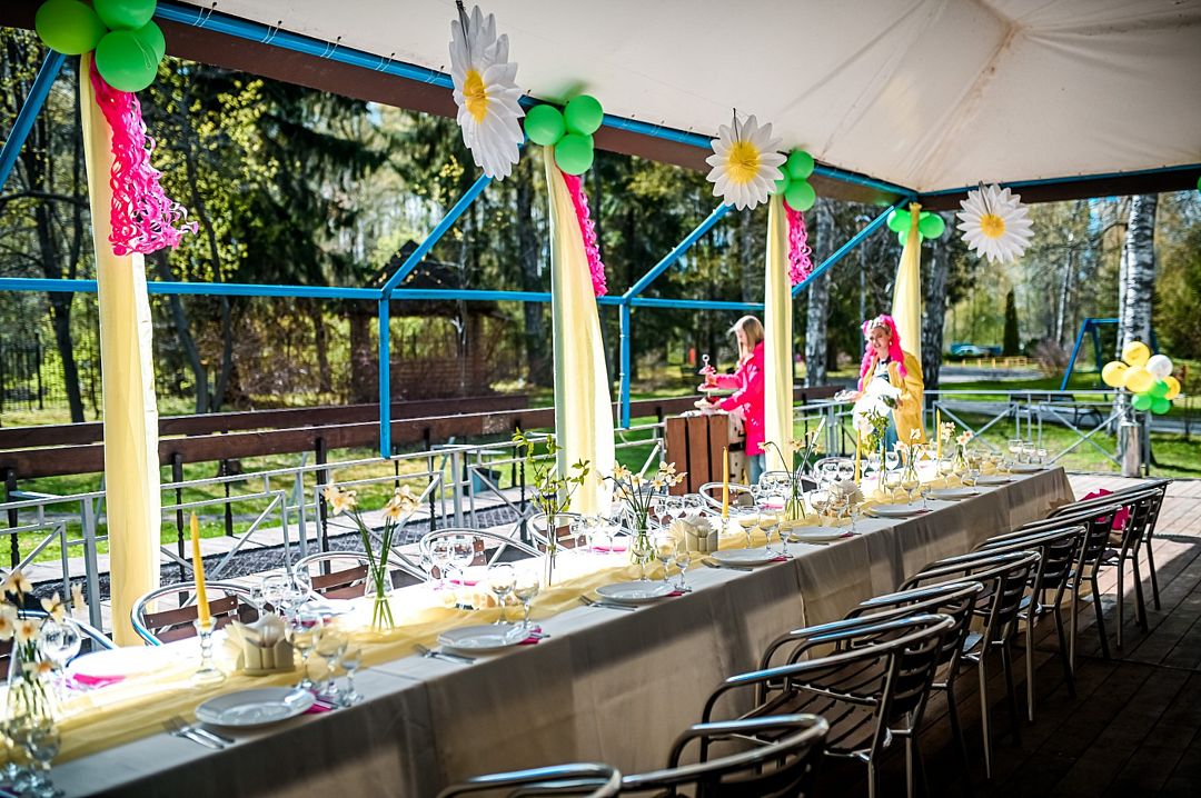 Загородная атмосфера создает идеальные условия как для небольших семейных встреч, так и для масштабных торжеств. Вы можете выбрать оформление в соответствии с темой мероприятия, а также пригласить аниматоров для создания незабываемой программы.