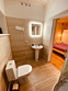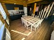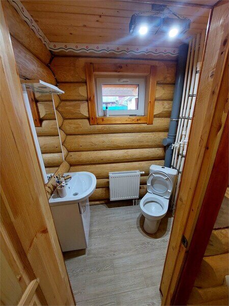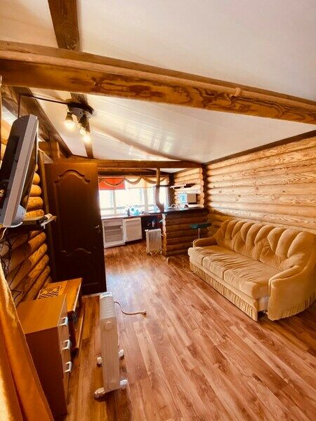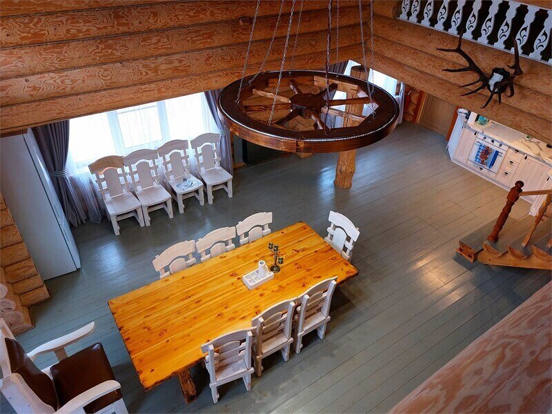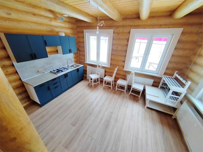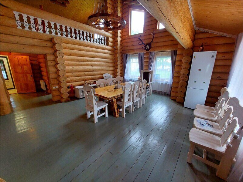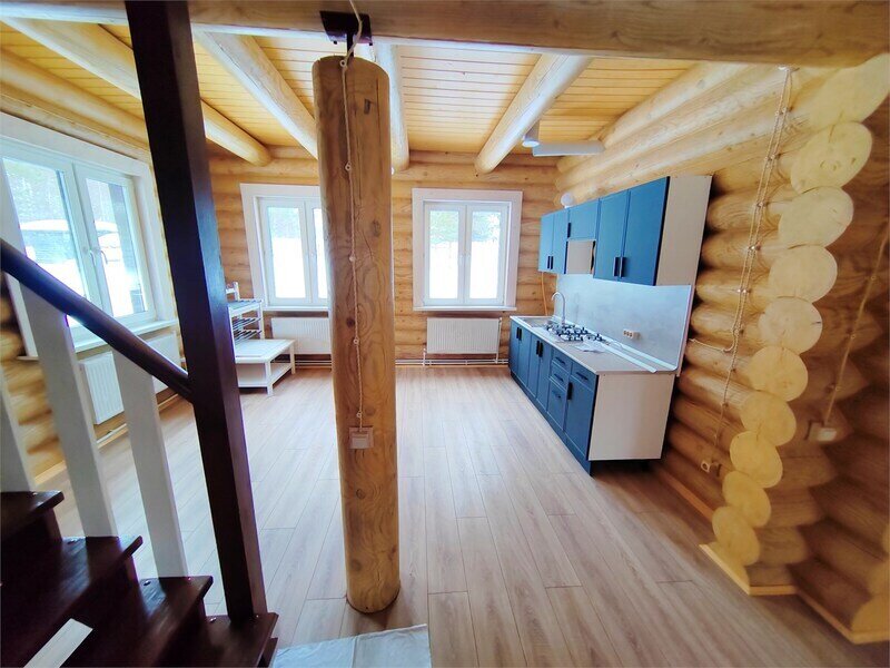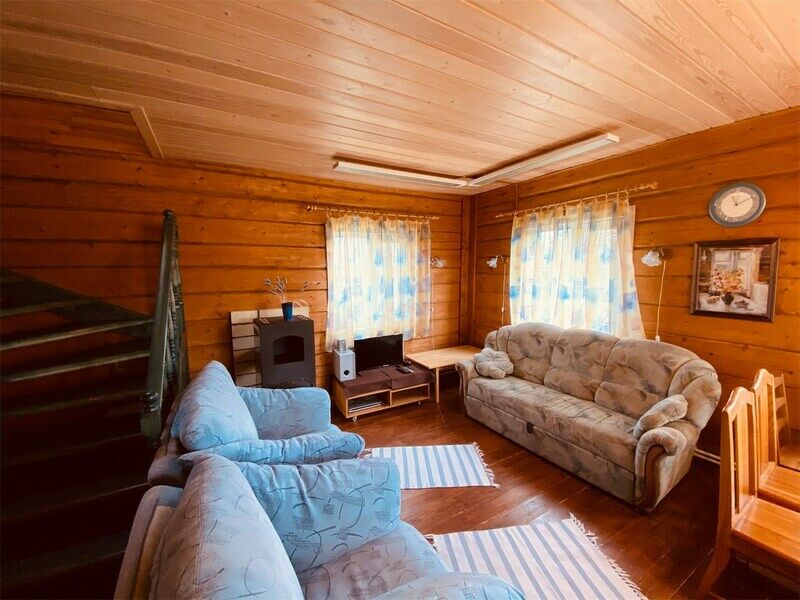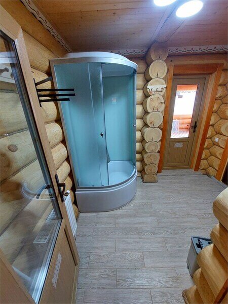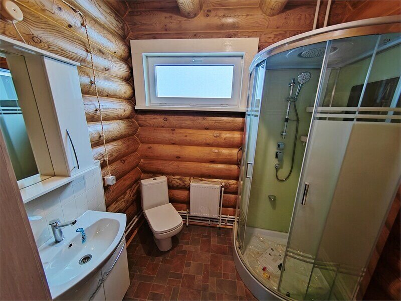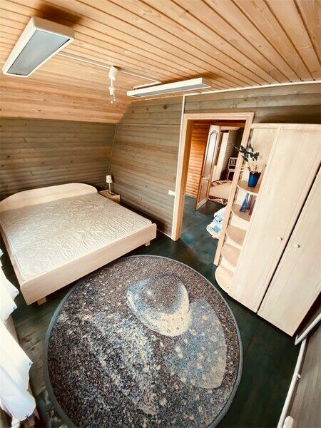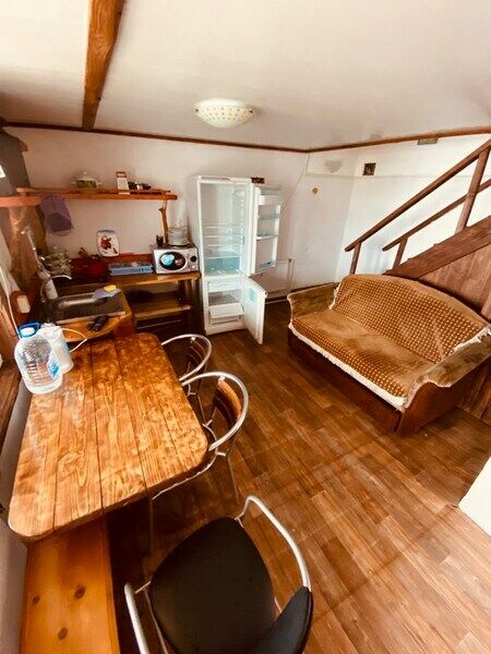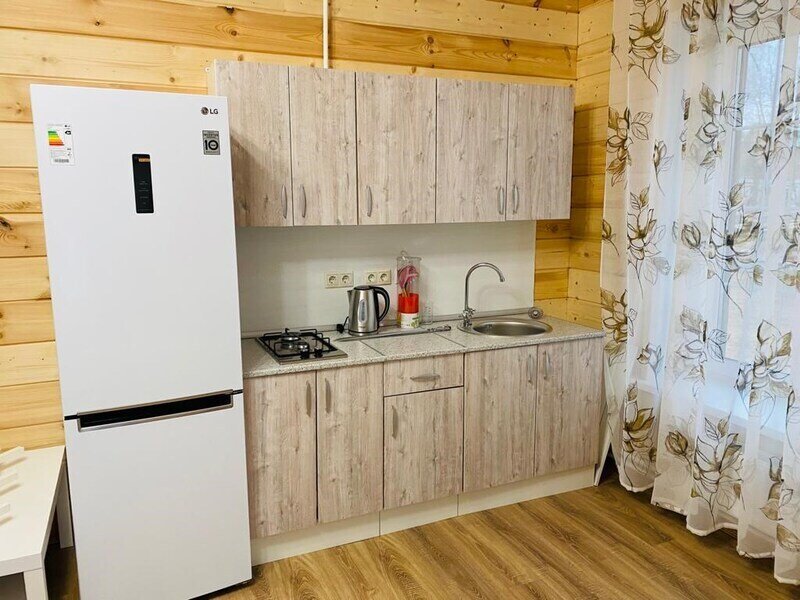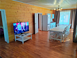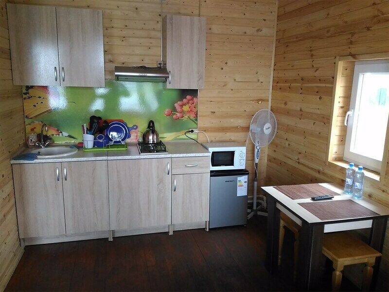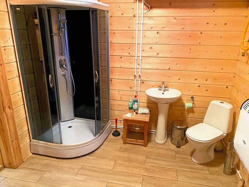 На превом этаже большая кухня гостинная с двуспальным диван-кроватью, санузел с душевой кабиной.