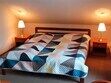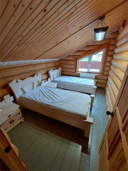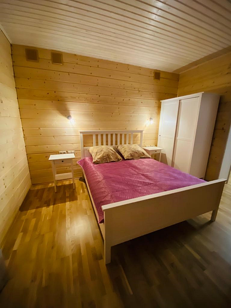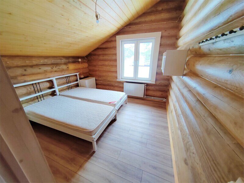 На втором этаже четыре спальни, в двух спальнях большие двуспальные кровати, в двух других по две односпальные кровати и также санузел с душевой кабиной.