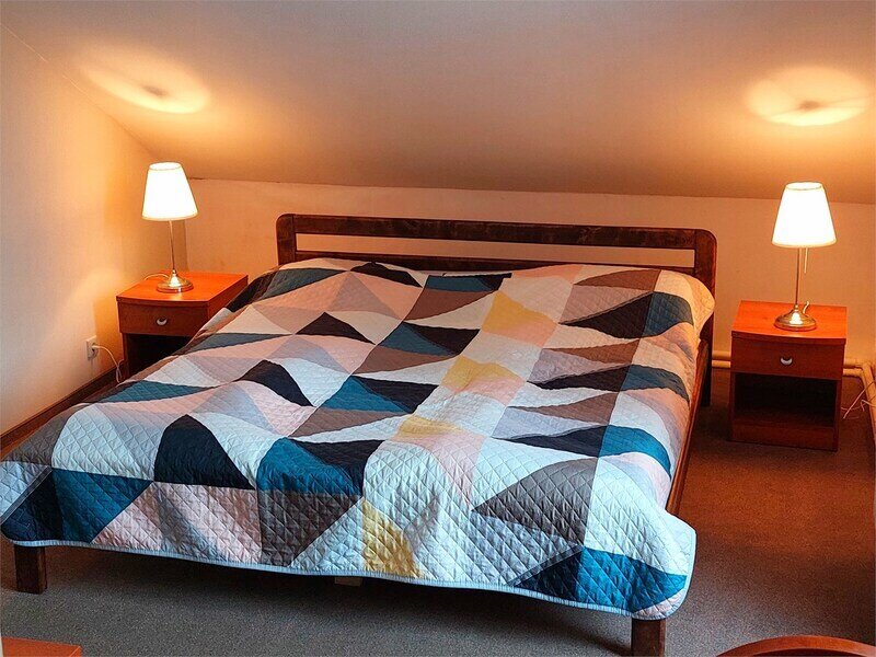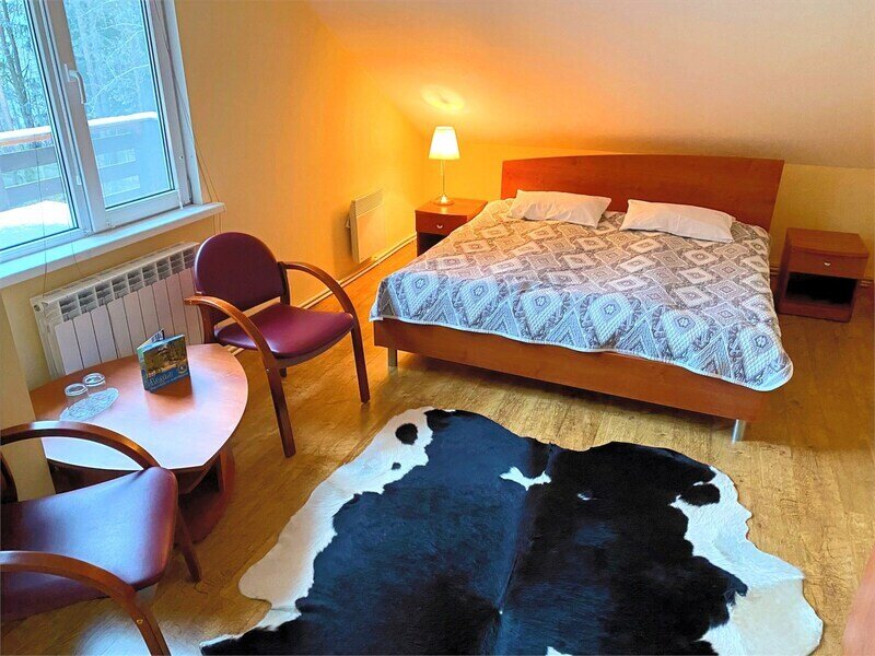 Двуспальная кровать + односпальная кровать. Кухня со всеми необходимыми принадлежностями, плитой, холодильником, микроволновой печью. Санузел с комфортной душевой кабиной. ЖК-телевизор. WI-FI. Большой балкон-терраса со столиками и шезлонгами, мангал, шампура. Прекрасный вид на озеро. Идеально подходит для двух человек или семейной пары с одним ребенком.