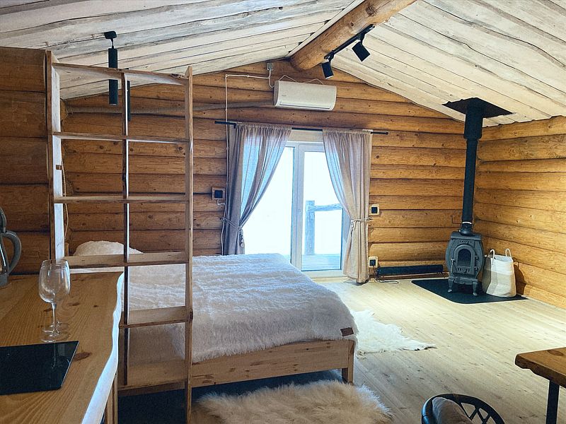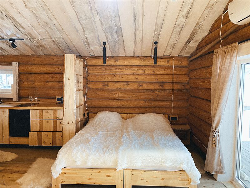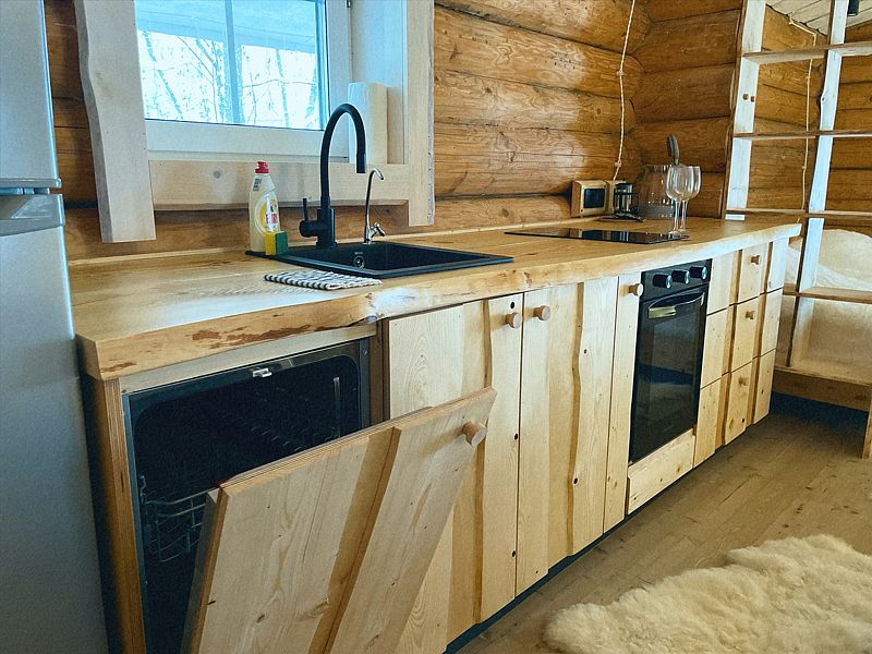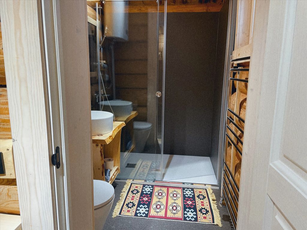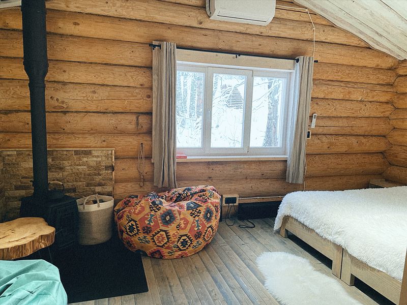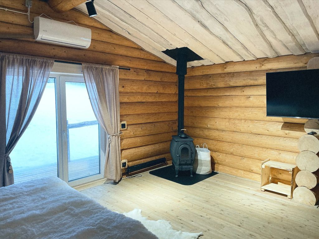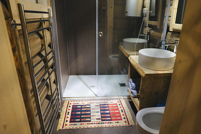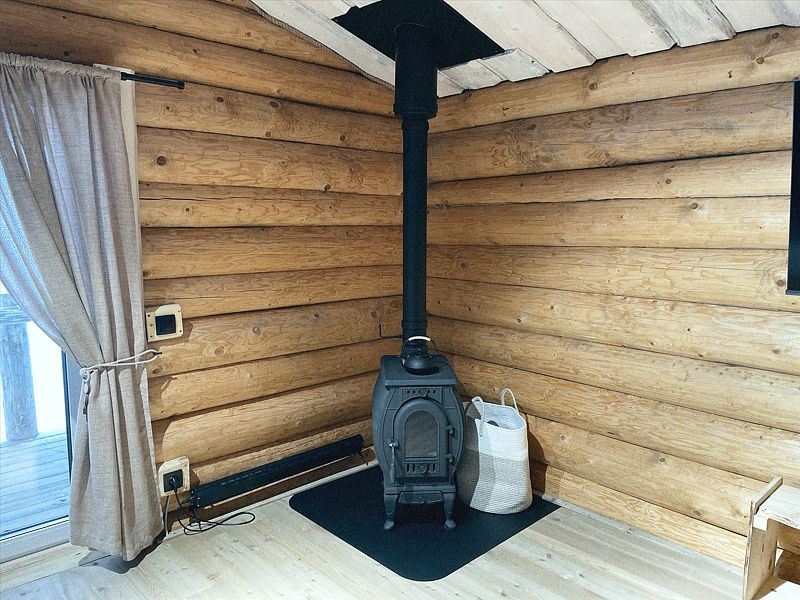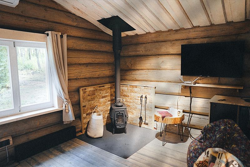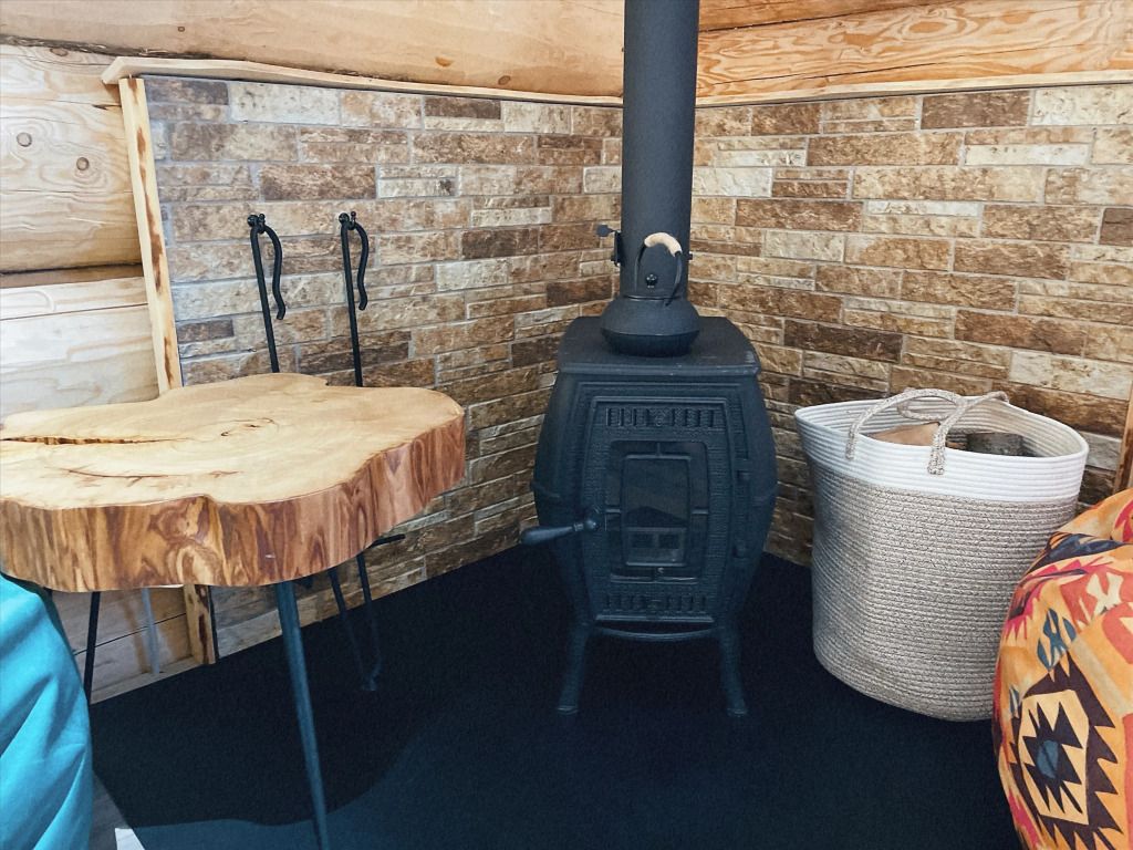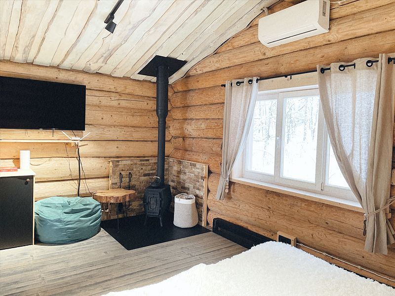 Дом с печкой-буржуйкой оснащен всеми необходимыми удобствами, включая два основных спальных места, телевизор с кабельными каналами, Wi-Fi, холодильник, посудомойка, духовка, чайник и кондиционер. В собственной ванной комнате установлена душевая кабина.