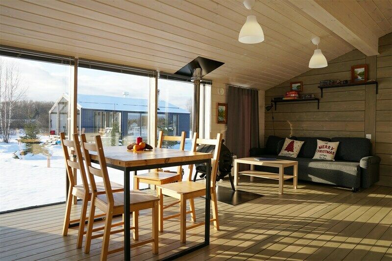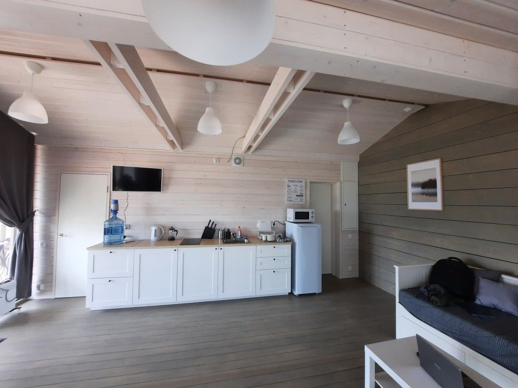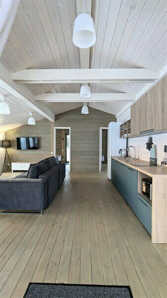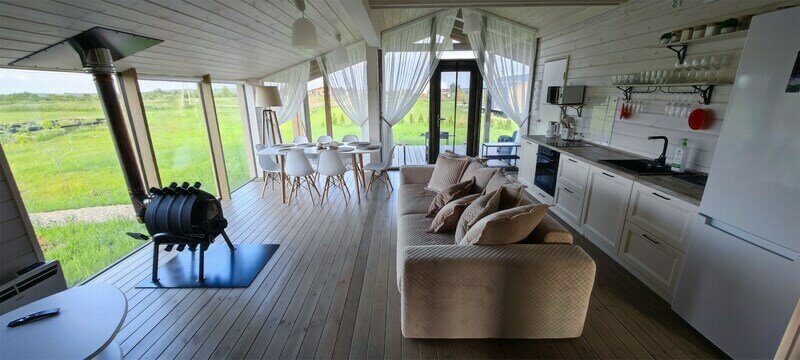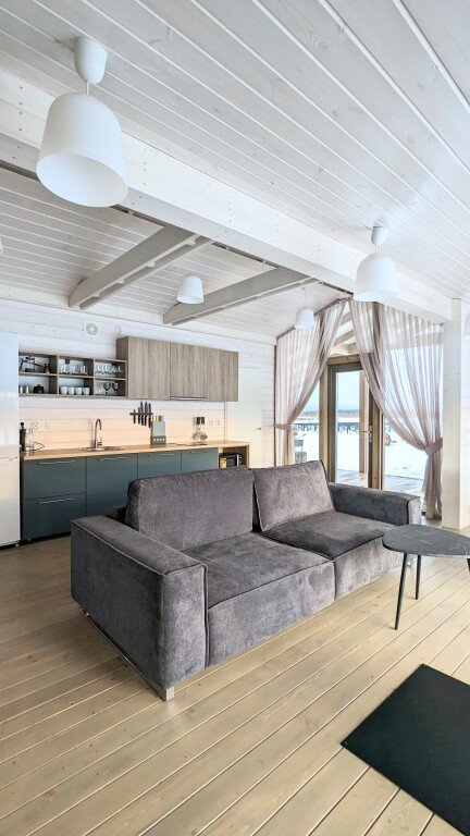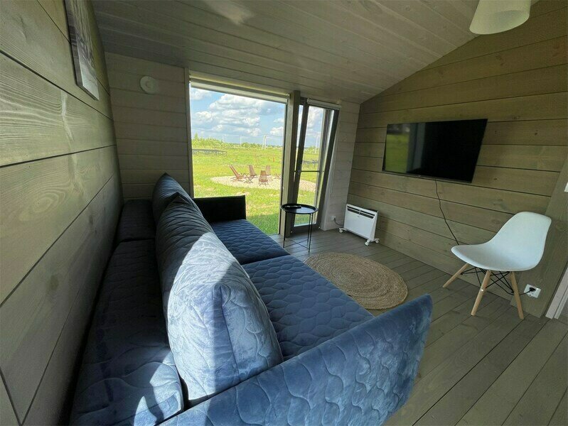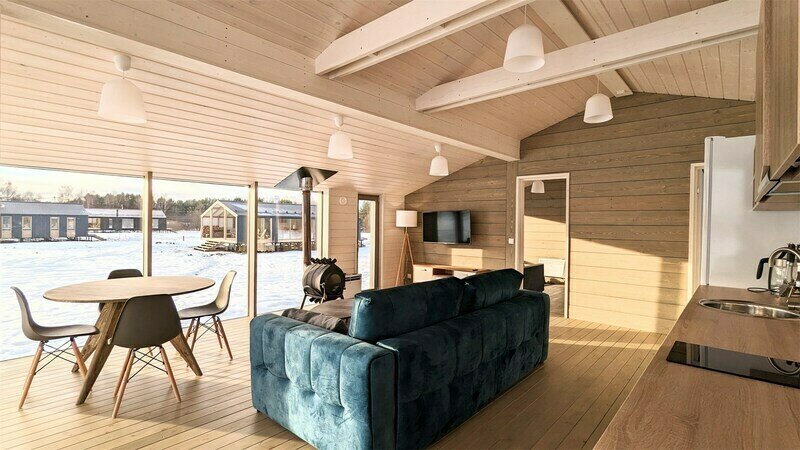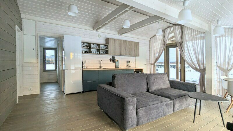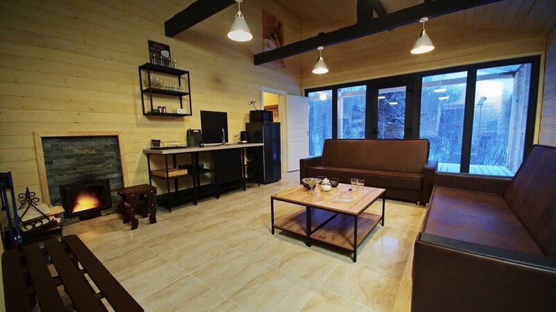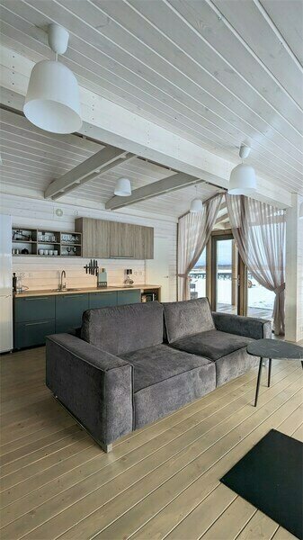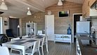 Удобная гостиная с камином, совмещенная с кухней. В доме одна спальня на для двух гостьей + 2 места для дополнительного размещения в гостиной. Возможно еще одно дополнительное место.