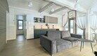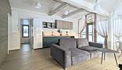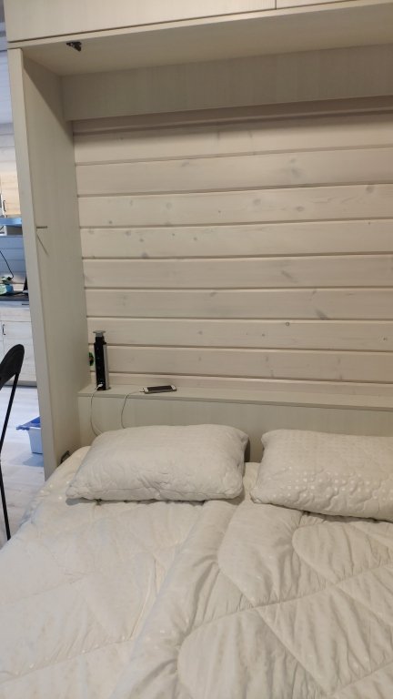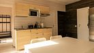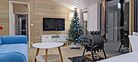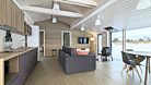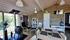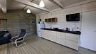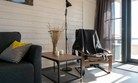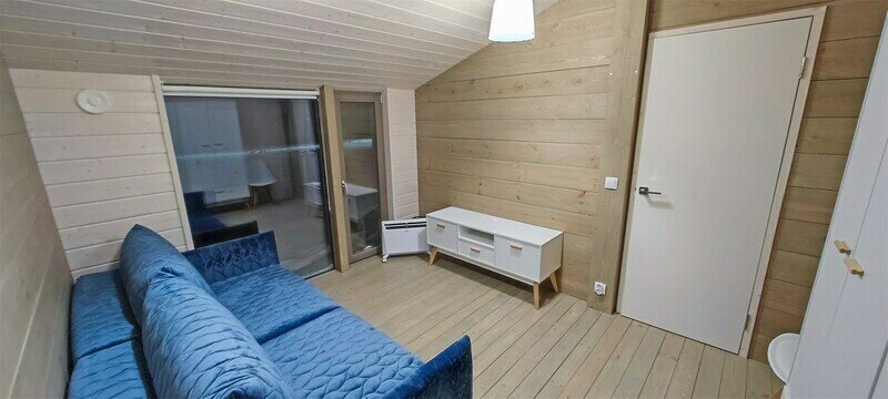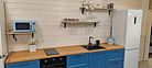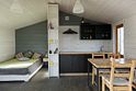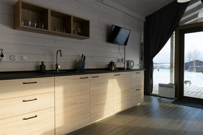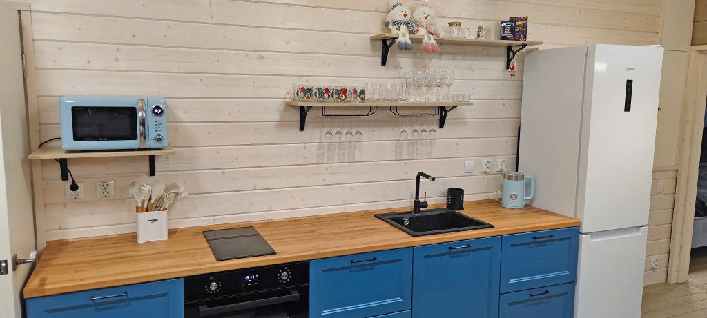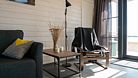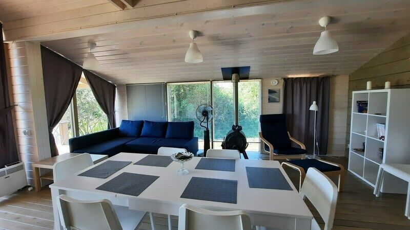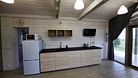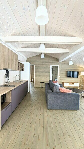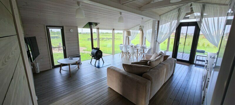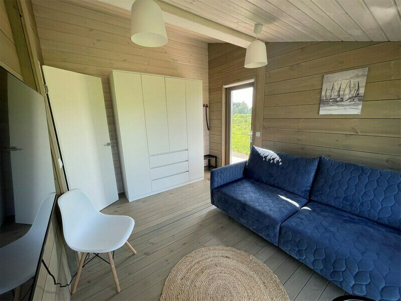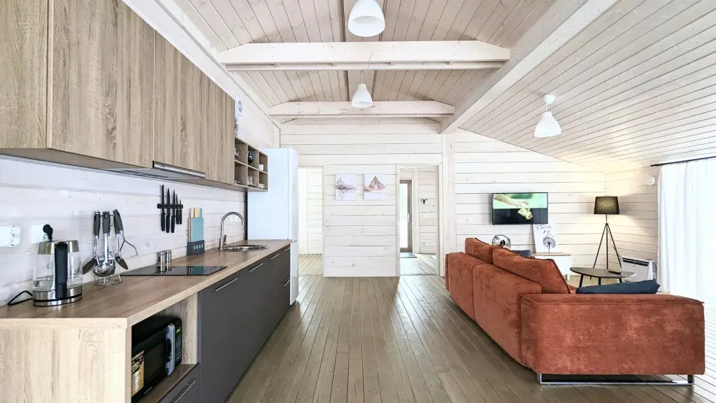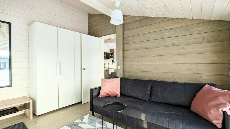 Удобная гостиная с камином, совмещенная с кухней. В доме одна спальня на для двух гостьей + 2 места для дополнительного размещения в гостиной. Возможно еще одно дополнительное место.