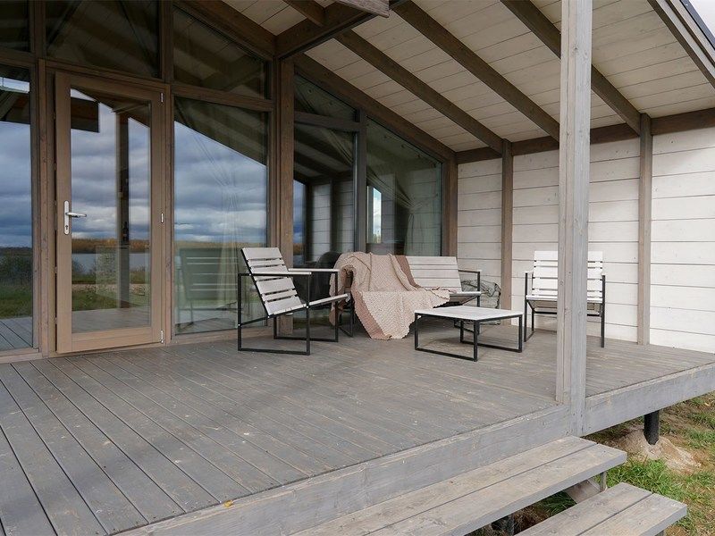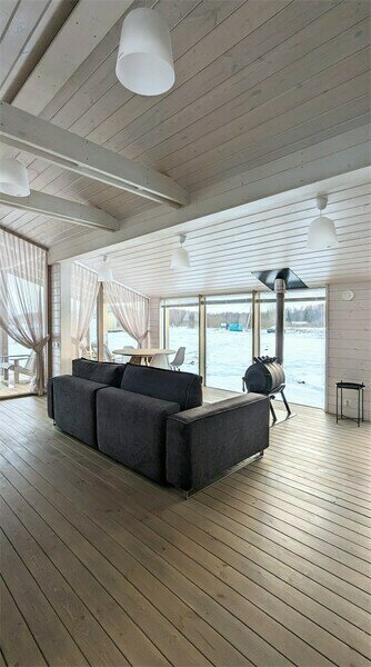Дом площадью 43 м² на второй линии от берега в 150 м от воды. Панорамное остекление и веранда, откуда открывается отличный вид на водохранилище.