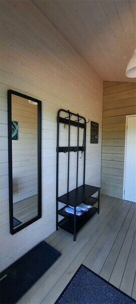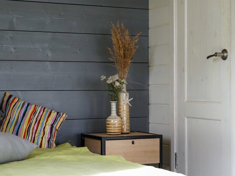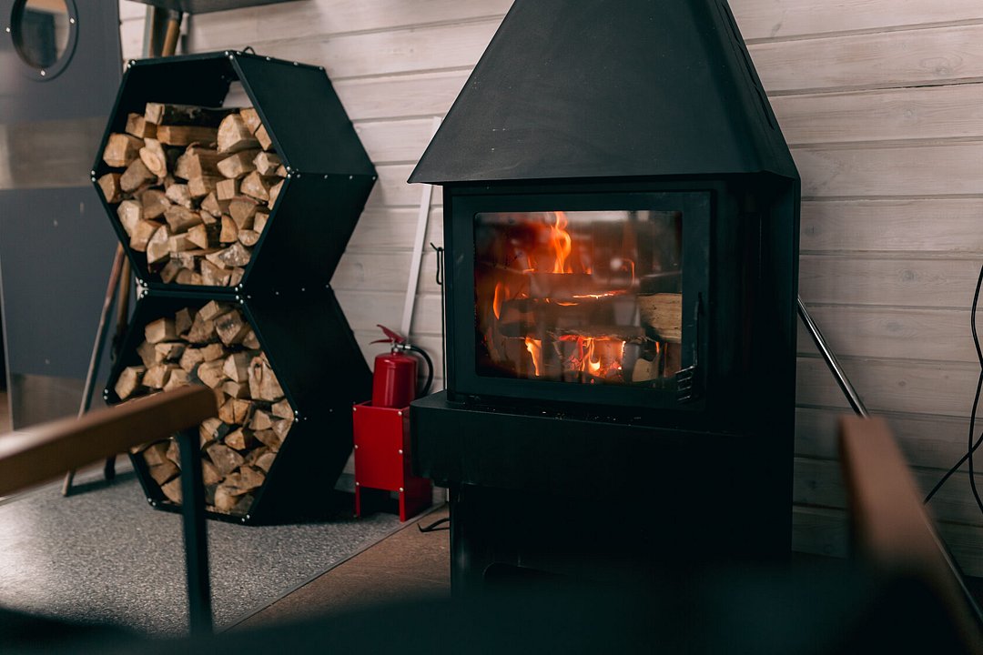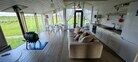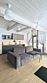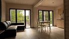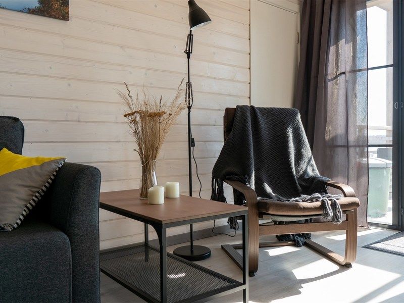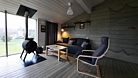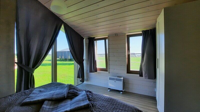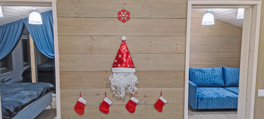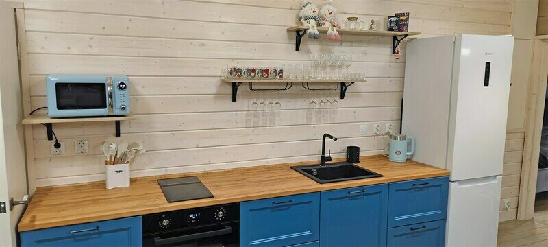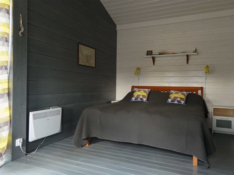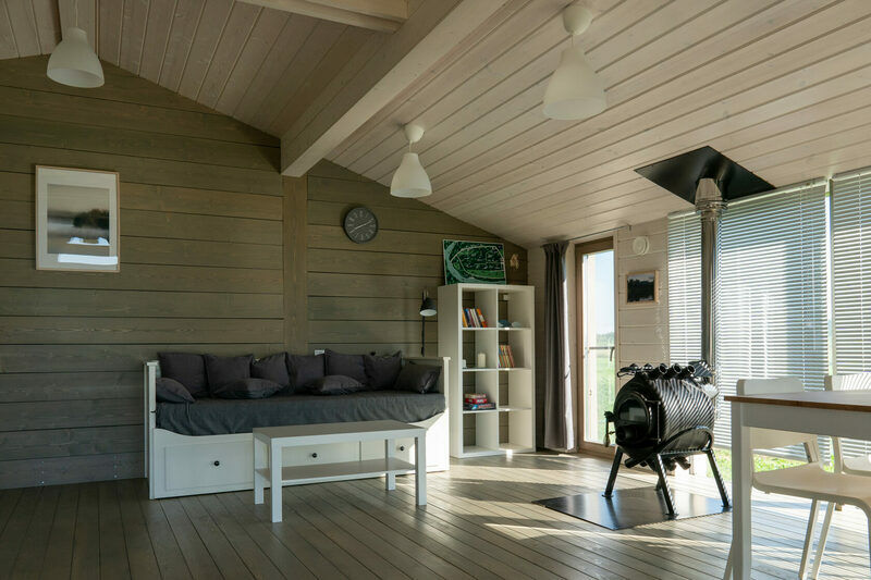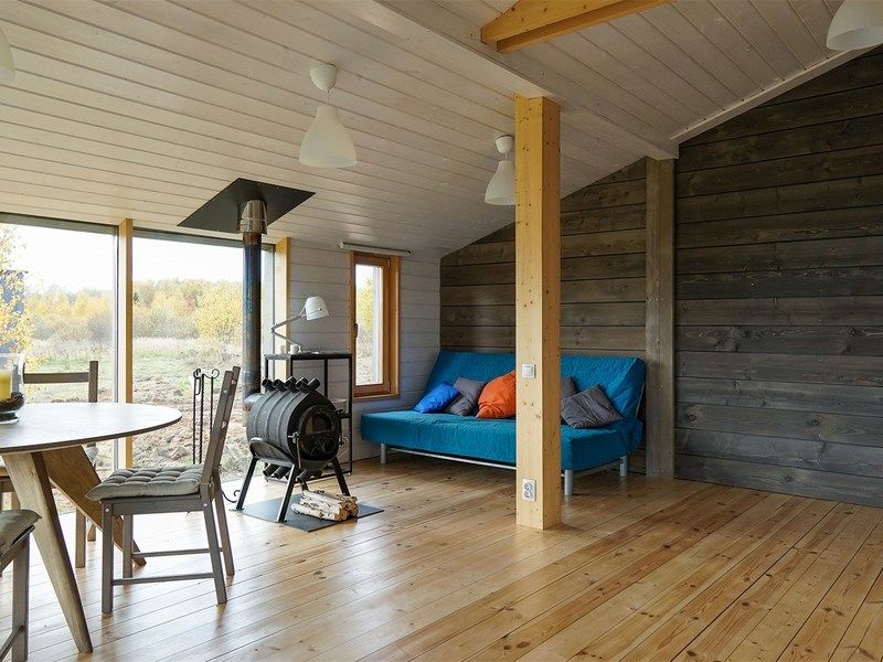 Удобная гостиная с камином, совмещенная с кухней. В доме одна спальня на для двух гостей + 2 места для дополнительного размещения в гостиной. Возможно еще одно дополнительное место.