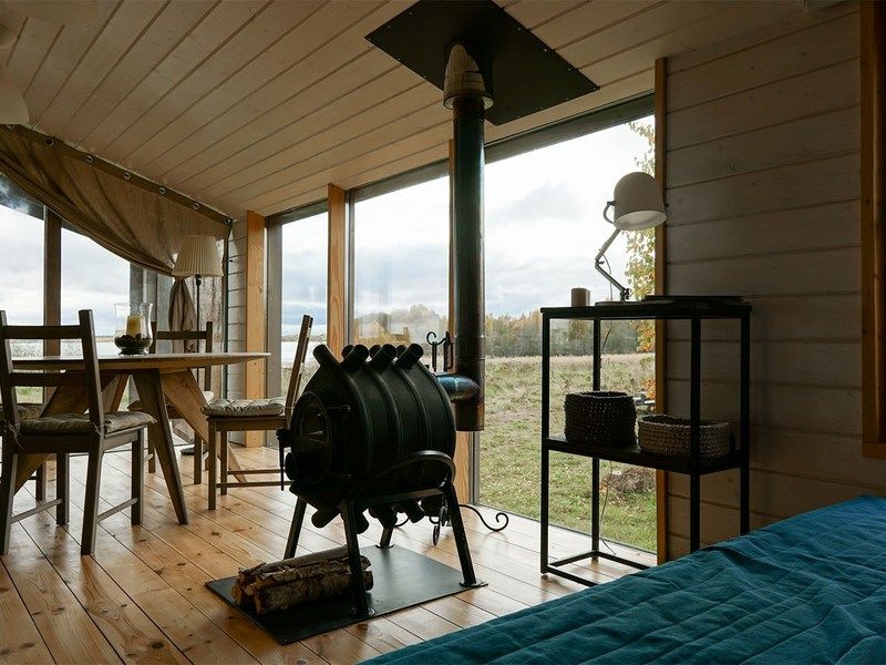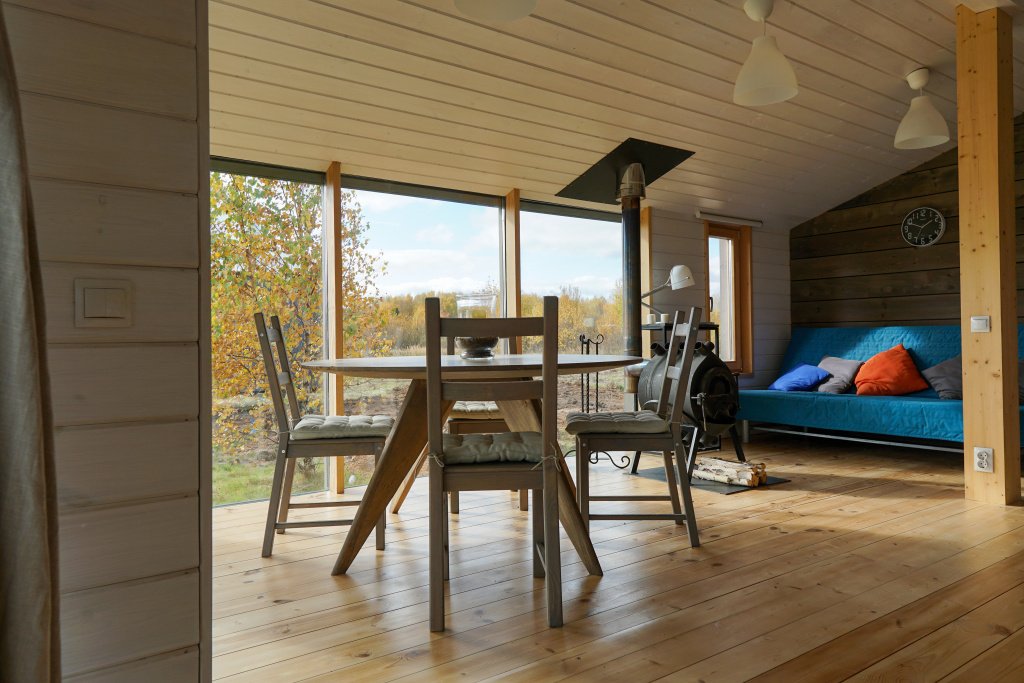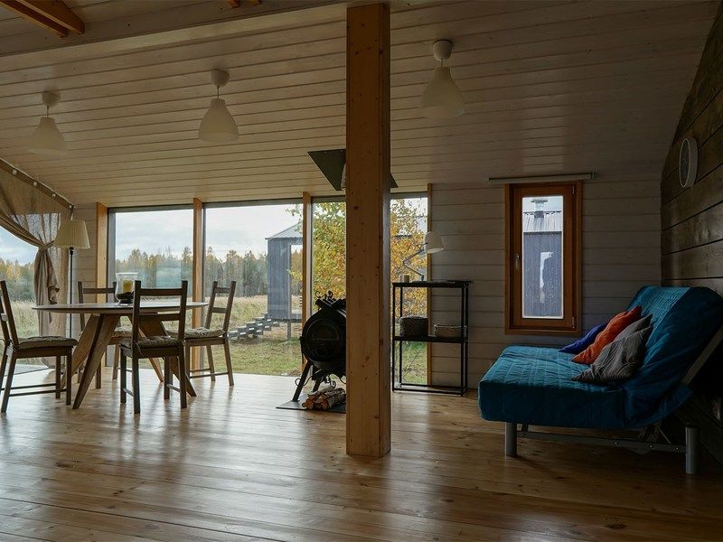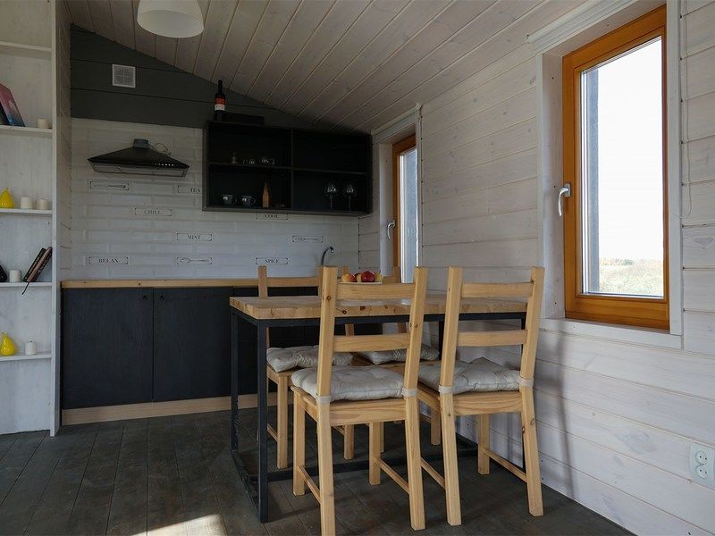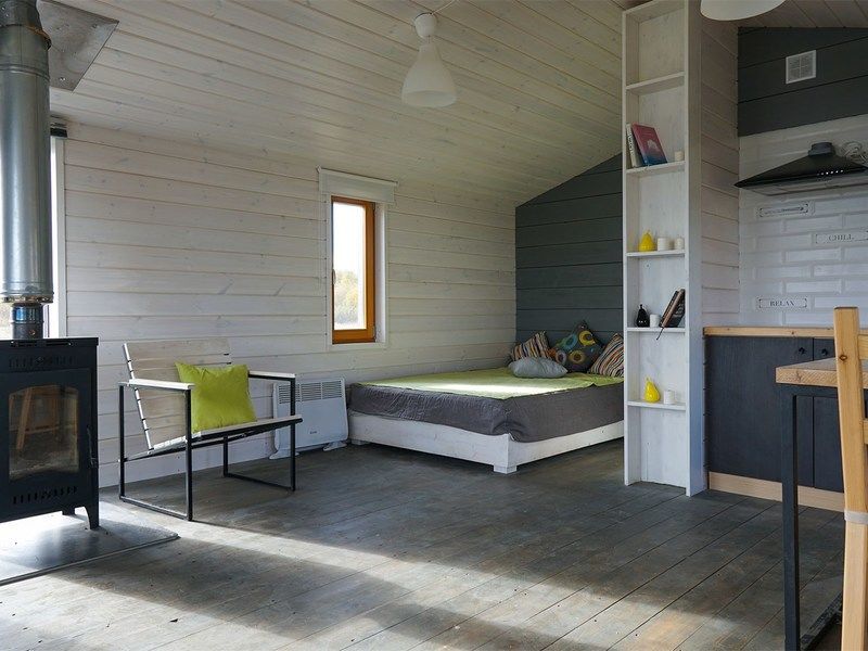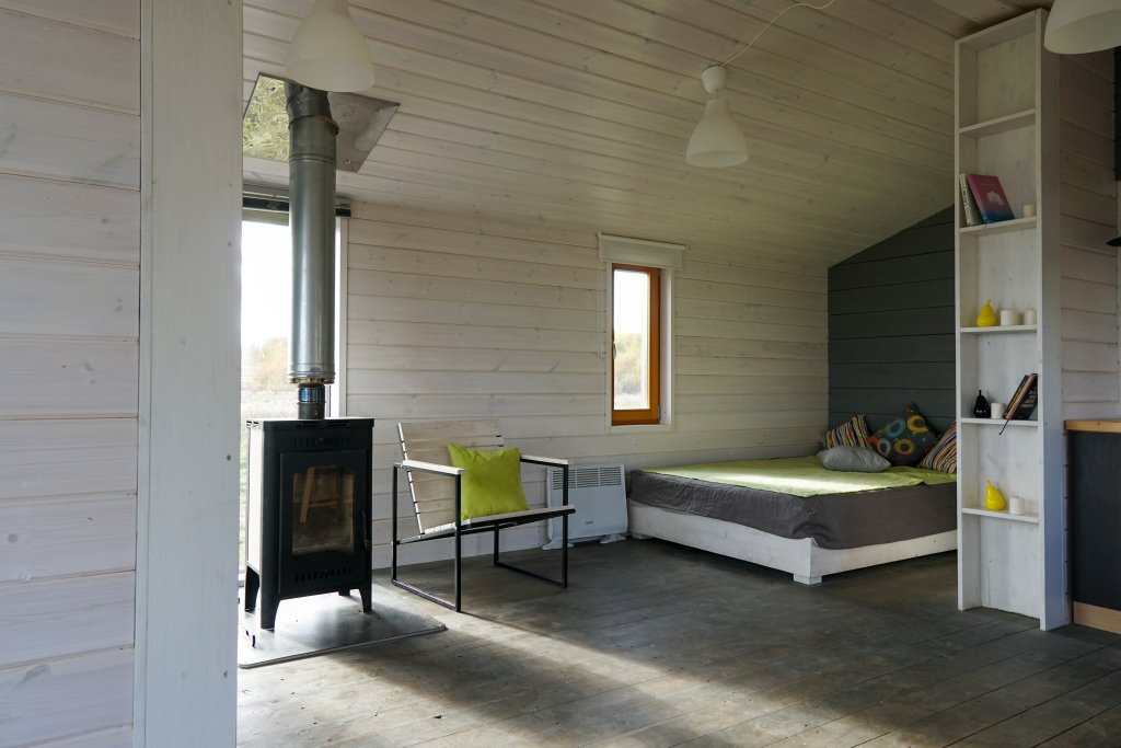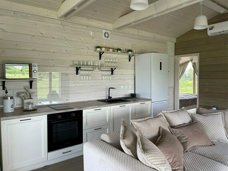 В доме одна комната, совмещенная с кухней и гостинной. Отлично подойдет для уединенного отдыха вдвоем.