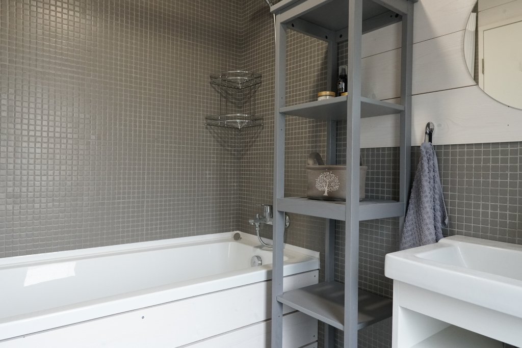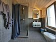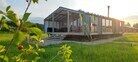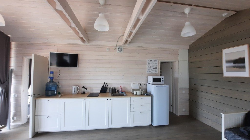 Домик 48 кв. м с баней и большой террасой. Оборудован 2-х спальной кроватью, раскладным диваном, кухней в общей гостиной-студии. Белье, полотенца, посуда, кухонные принадлежности в комплекте. Свой мангал с решеткой. Находится в уединенном месте у берега вдали от остальных домиков.