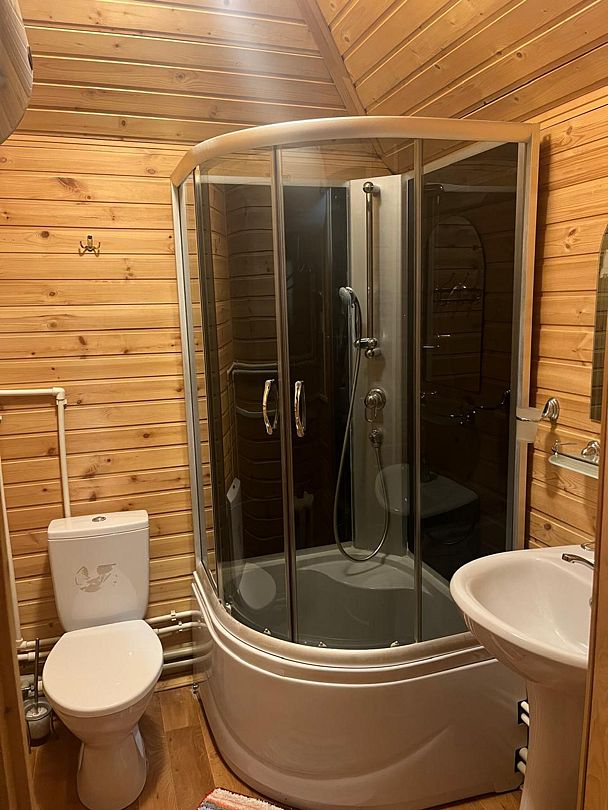Ванная комната с душевой кабиной и туалетом. По два полотенца на каждого гостя.