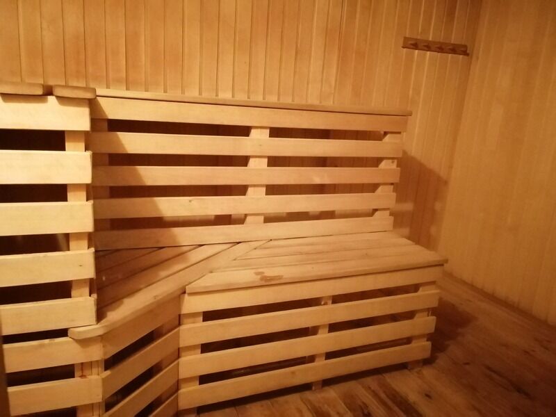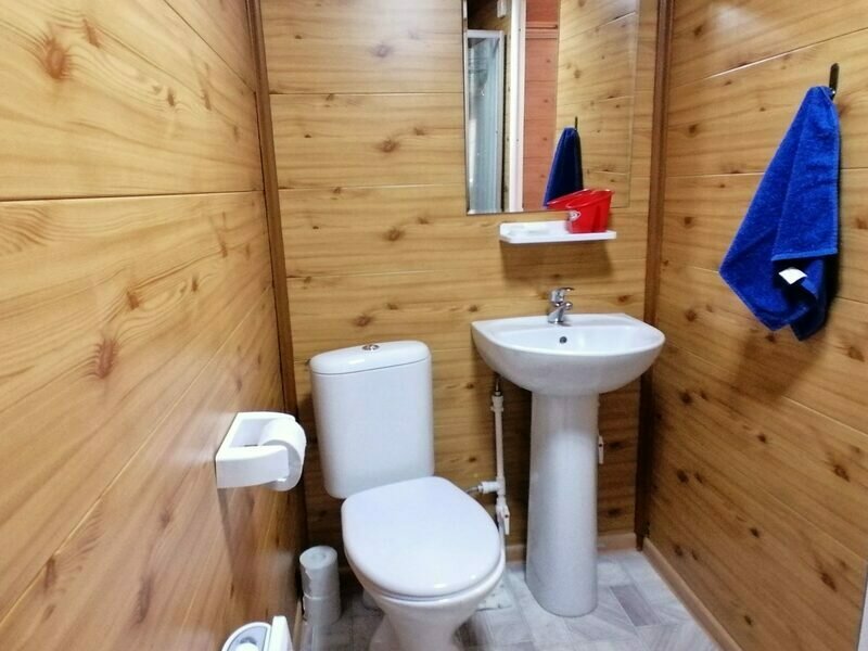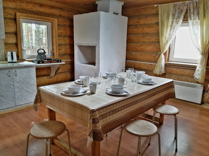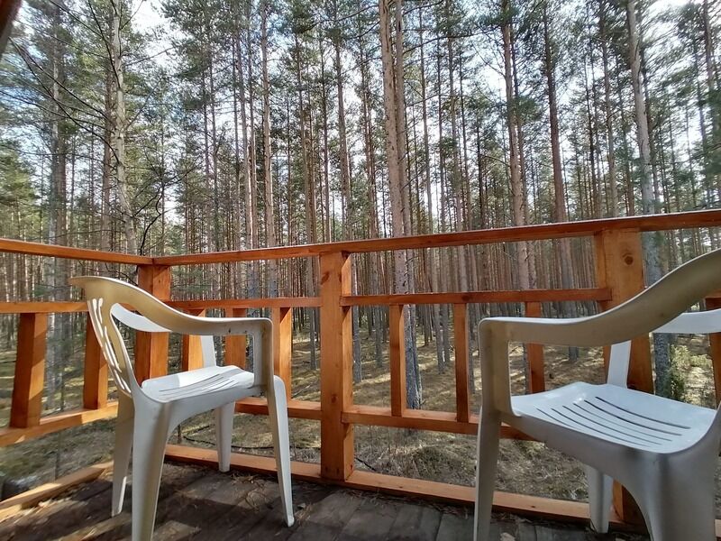 На первом этаже расположена веранда, кухня-столовая, санузел, душевая и баня. На втором этаже две спальни по три односпальные кровати в каждой и балкон с видом на сосновый бор.