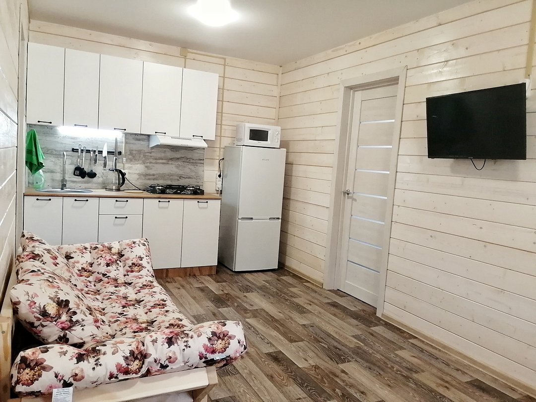 Летний дом на 4 человека с двумя спальнями, кухней-гостиной и совмещённым санузлом. Часть дома с отдельным входом, спальни расположены на 2-ом этаже, кухня и санузел на первом.