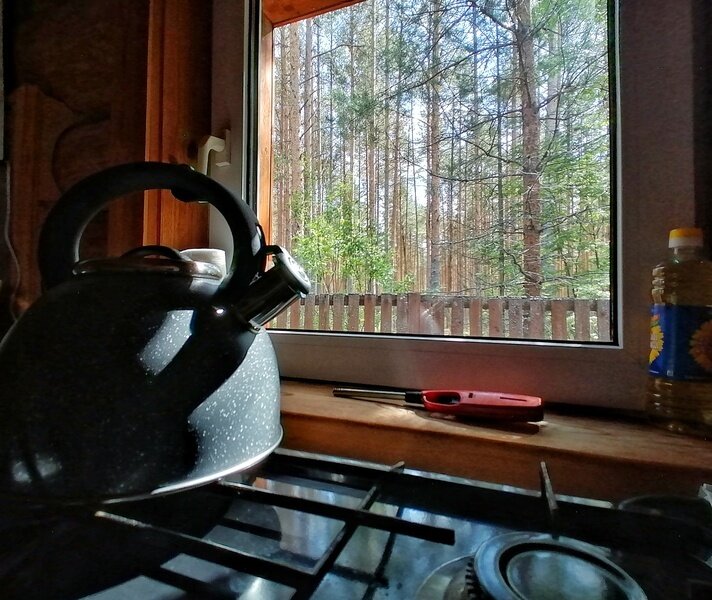 Кухня оборудована всей необходимой техникой, посудой и утварью.