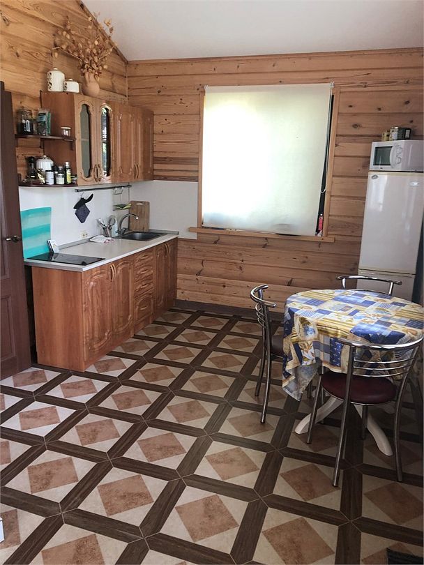 Деревянный дом из бруса. Полностью своя территория, только для этого дома. Территория огорожена забором. Дом стоит примерно посередине участка. Сам участок находится перед входом в лес. Внутренняя отделка дома из дерева.