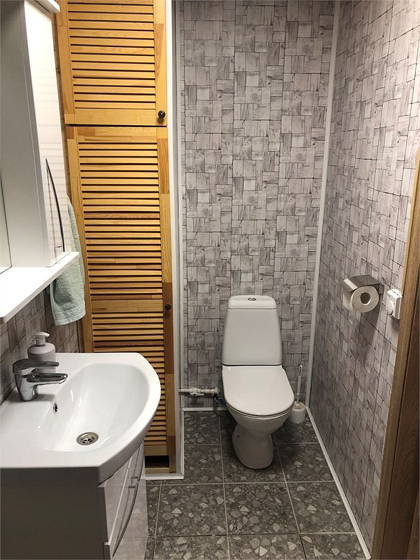 В доме три комнаты: две спальни и гостиная, коридор и туалет с душем. Большая веранда с видом на участок. Подход к дому по дорожкам из камня.