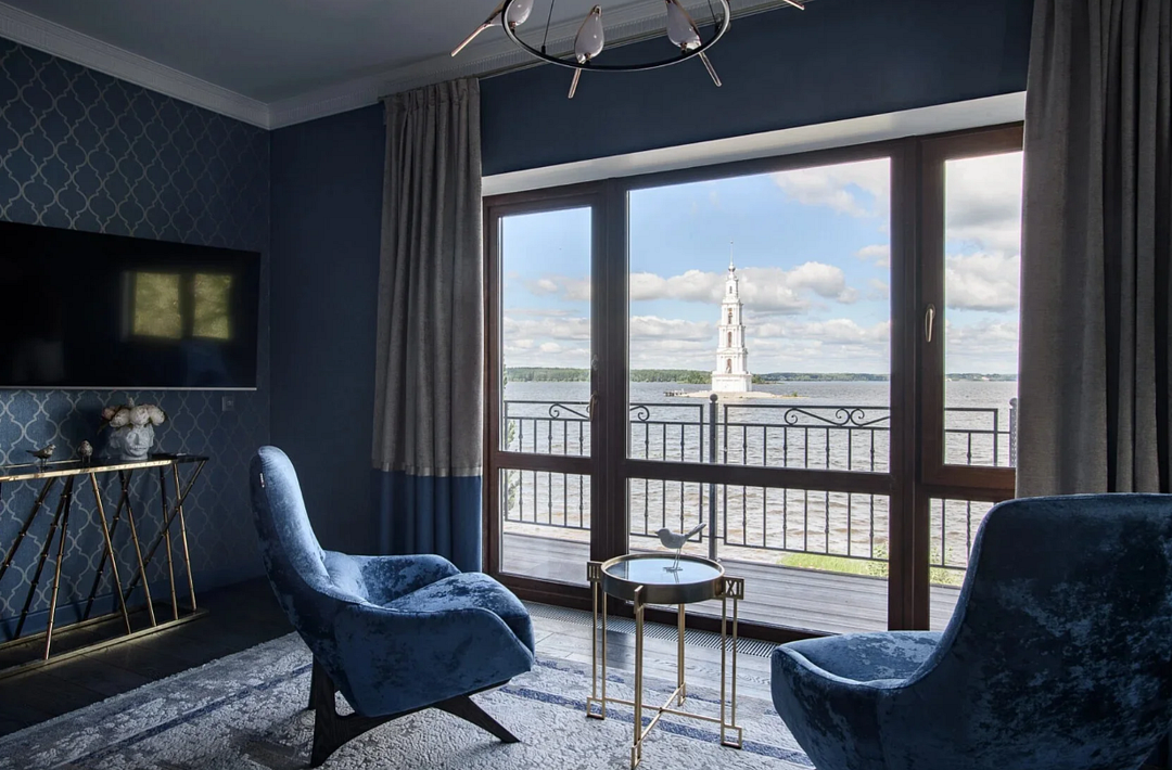Wi-Fi, фен, ванная комната, душевая кабина, санузел, халаты, банные полотенца, тапочки, балкон, кровать «King size», диван, стулья, шкаф для одежды, журнальный столик, ковер, две комнаты, унитаз, раковина, мягкая мебель, питьевая вода, душ, вид на реку, паркет, туалетный столик, стул, тумба, туалетный столик, сплит-система, панорамные окна, диван-кровать, раскладной диван, телевизор с плоским экраном, номер для некурящих, двуспальный раскладной диван-кровать, уборка номера, туалетные принадлежности премиум-класса, вешалки-плечики, бутилированная водаВ гостиничном номере