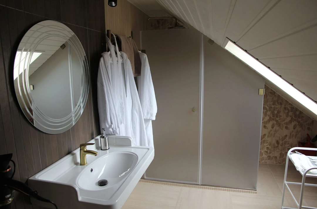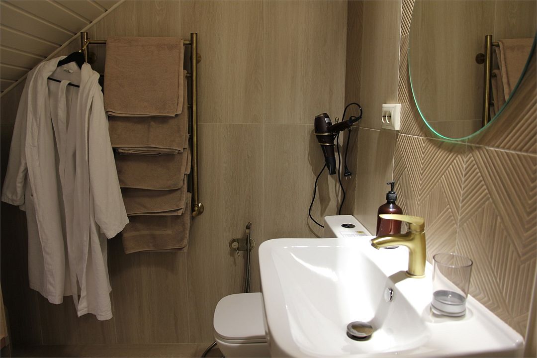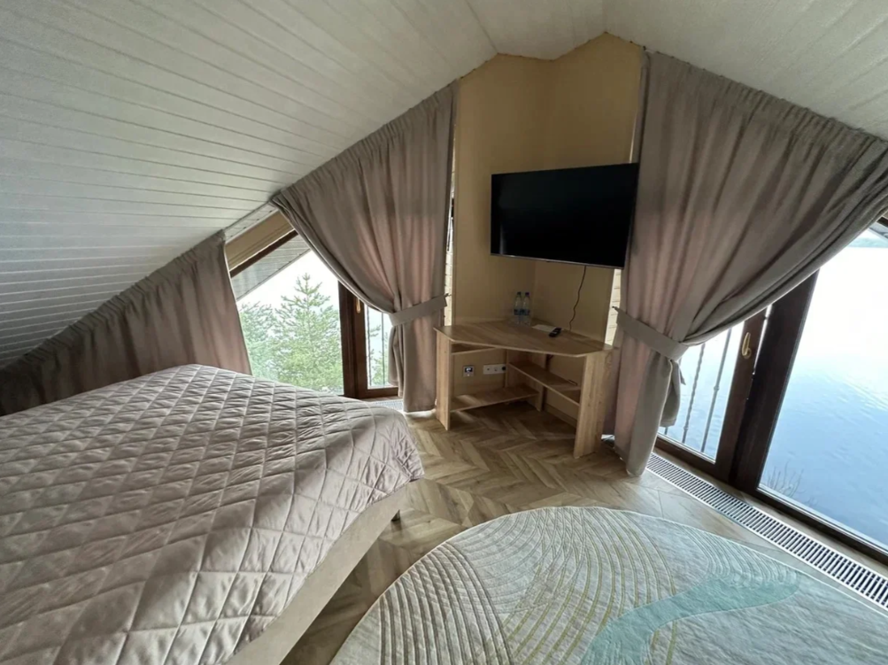 телевизор, Wi-Fi, интернет, кондиционер, фен, ванная комната, душевая кабина, санузел, банные принадлежности, халаты, тапочки, гигиенические средства, кровать «Queen size», шкаф для одежды, вешалки, ковер, унитаз, раковина, душ, вид на реку, вид во двор, ламинат, стул, стол, туалетные средства, туалет, телевизор с плоским экраном, мансардные окна, телевизор со Smart TV, номер для некурящих, бутилированная вода, мыло, затемняющая штораВ гостиничном номере