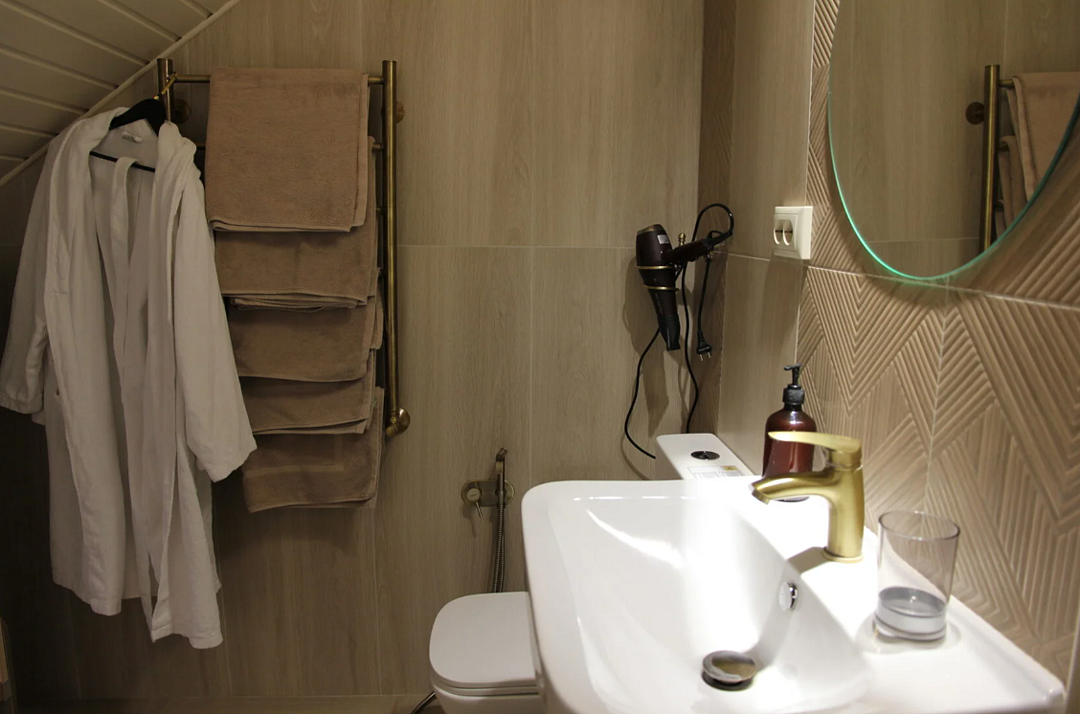 телевизор, Wi-Fi, интернет, кондиционер, фен, ванна, халаты, тапочки, балкон, балкон с красивым видом, кровать «Queen size», унитаз, раковина, вид на реку, вид во двор, цифровое тв, телевизор с плоским экраном, мансардные окна, телевизор со Smart TVВ гостиничном номере