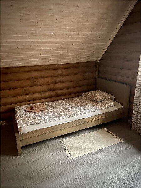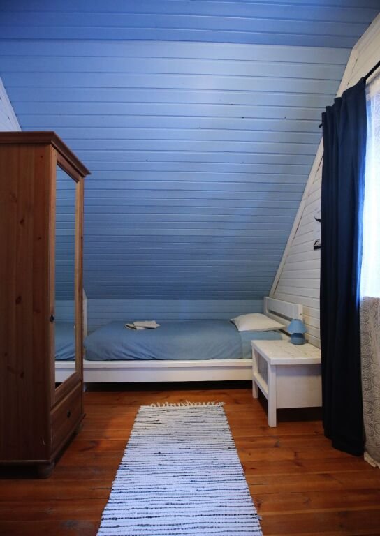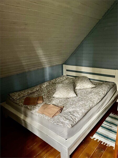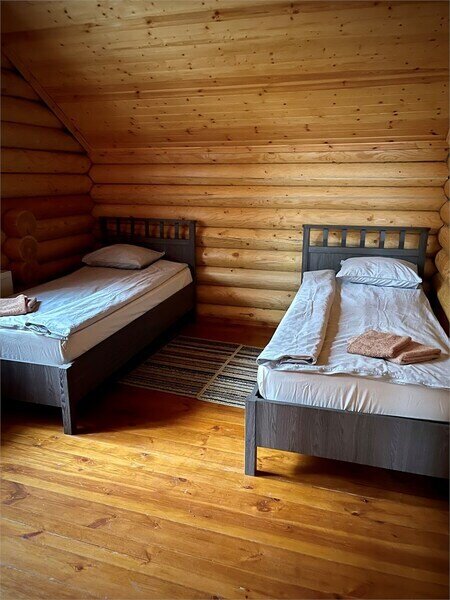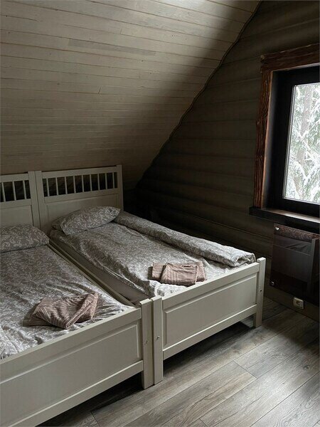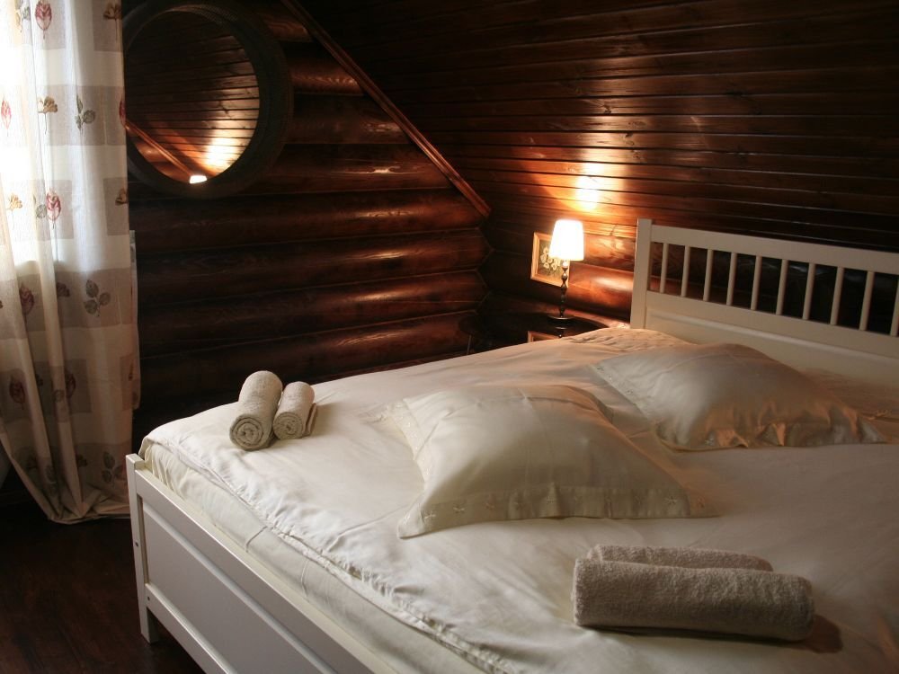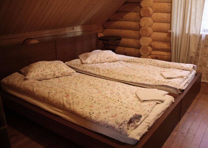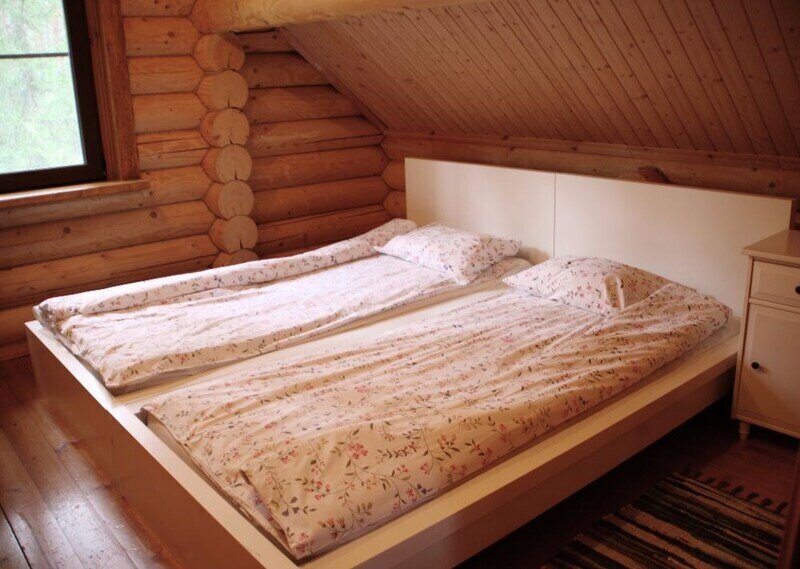 В одной спальне большая кровать, во второй две односпальные кровати. На счёт спален вопросов нет, всё очень комфортно. На 2-м этаже, кстати, не влажно и спать с открытыми окнами в лесу потрясающе.