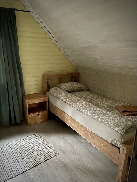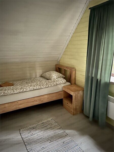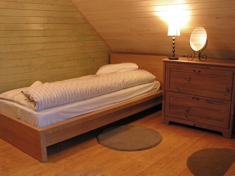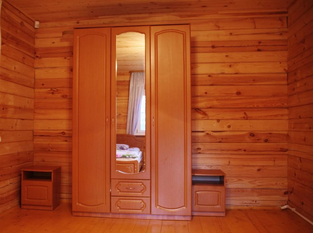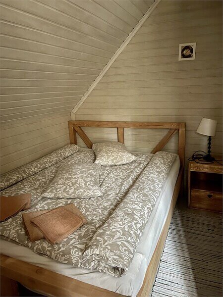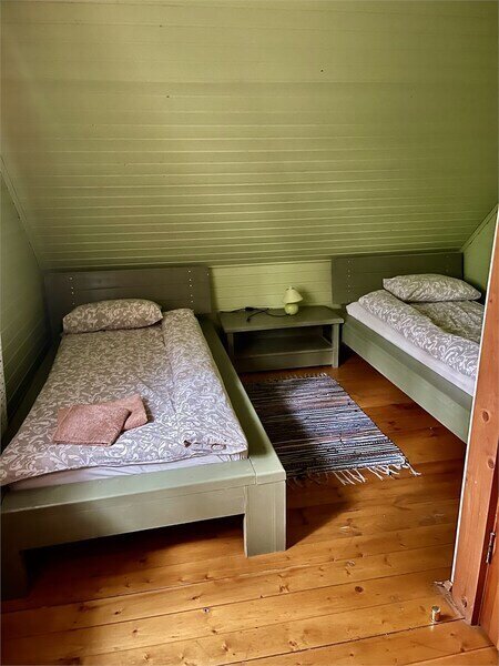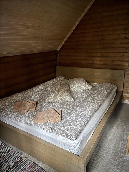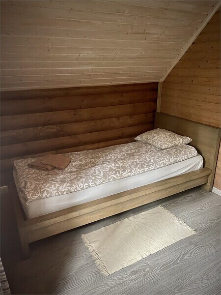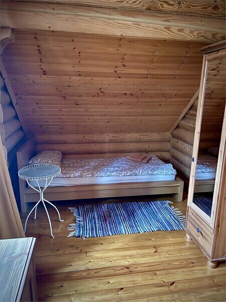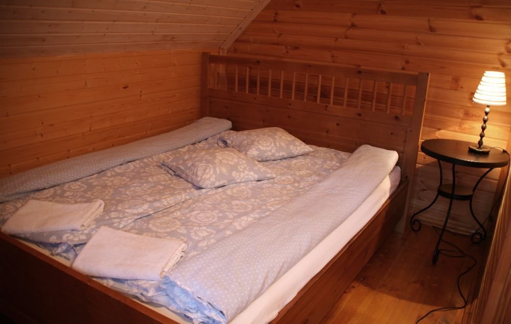 В одной спальне большая кровать, во второй две односпальные кровати. На счёт спален вопросов нет, всё очень комфортно. На 2-м этаже, кстати, не влажно и спать с открытыми окнами в лесу потрясающе.