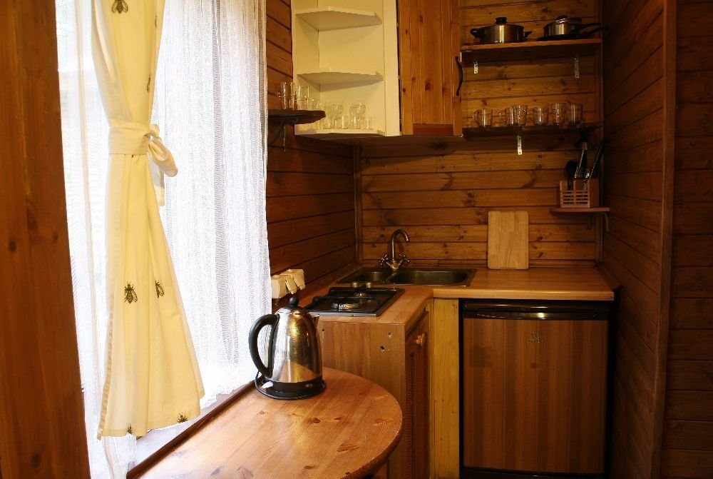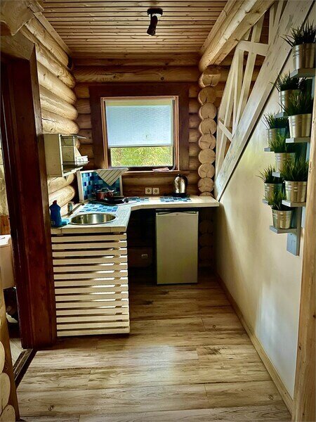 Уютный двухэтажный домик для двоих с камином. На первом этаже кухня и гостиная зона с телевизором и диваном. На втором этаже спальня с большой кроватью и прекрасным видом из окна.