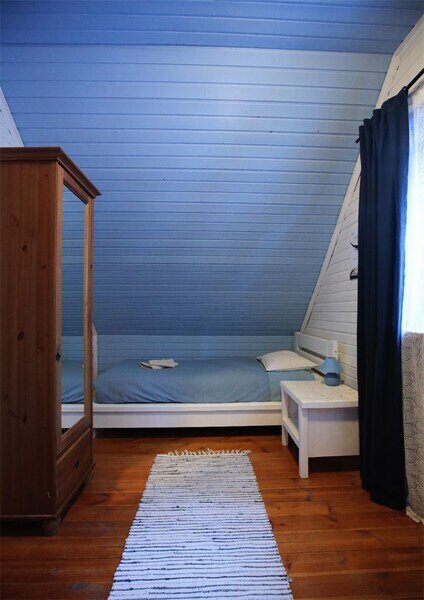 На втором этаже расположились спальня с двуспальной кроватью и спальня с двумя односпальными кроватями. В холле между спальнями есть дополнительное спальное место.