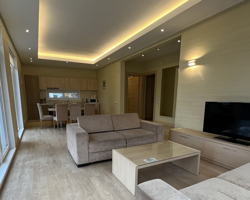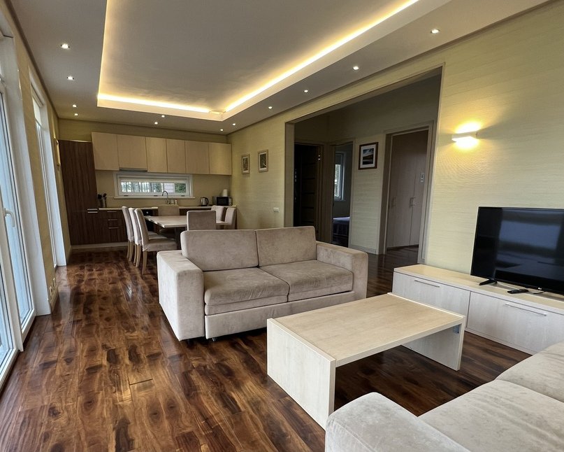 Уютная гостиная со столовой зоной и полностью оборудованной кухней (чайник, холодильник, плита, микроволновая печь, посудомоечная машина), три спальные комнаты, две ванные комнаты.