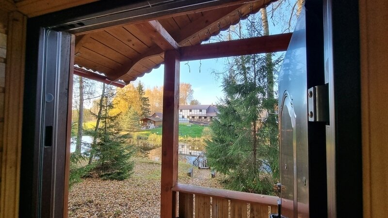 Отдельная баня со всеми удобствами: обливочное ведро, комфортная зона для отдыха на 6 человек, красивая панорама на пруд.