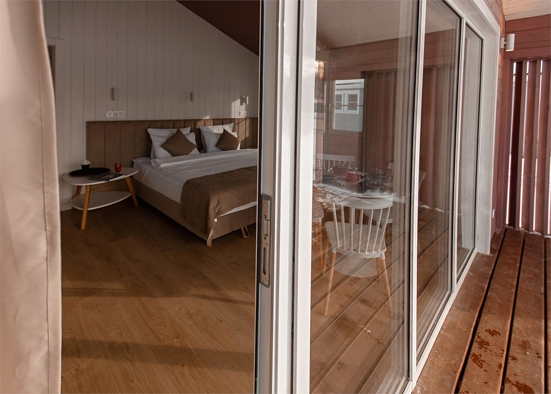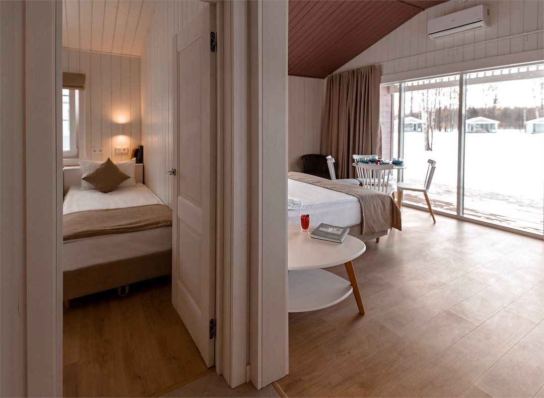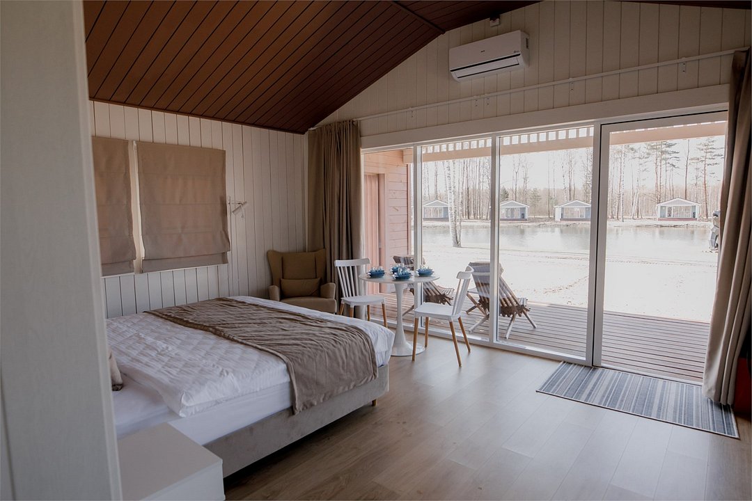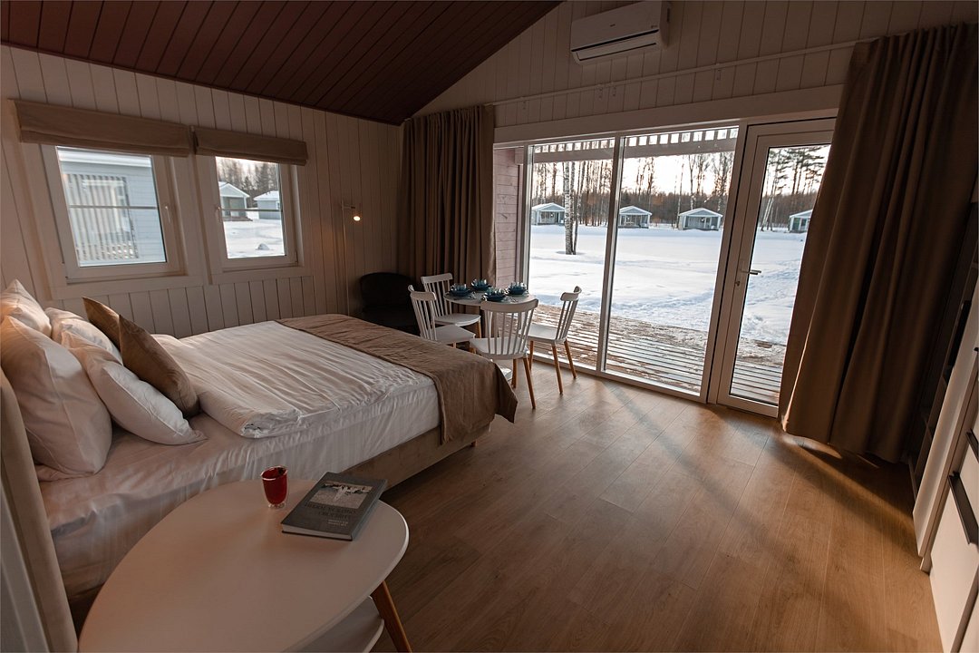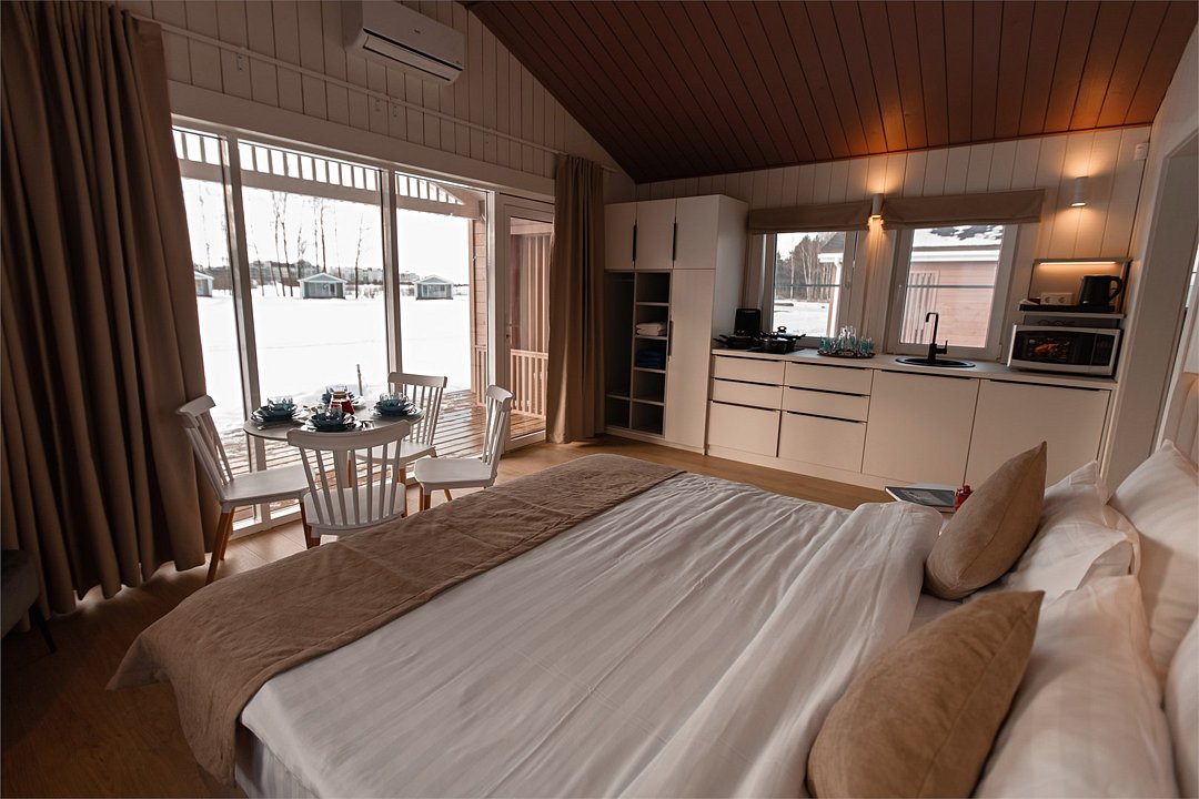 В современных стильных двухкомнатных домах есть полностью оборудованные кухни, что позволяет провести время в кругу семьи или друзей. В каждой из двух комнат уютно разместится по два человека, а пожелания по выбору односпальных или двуспальных кроватей можно указать при бронировании. В каждом доме предусмотрен санузел с современной душевой кабиной, а просторная терраса с видом на озеро и панорамные окна создают атмосферу единения с природой. Здесь вам будет удобно как отдыхать, так и заниматься важными делами — в домах есть рабочие места с достаточным количеством розеток для зарядки гаджетов.
