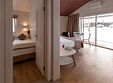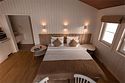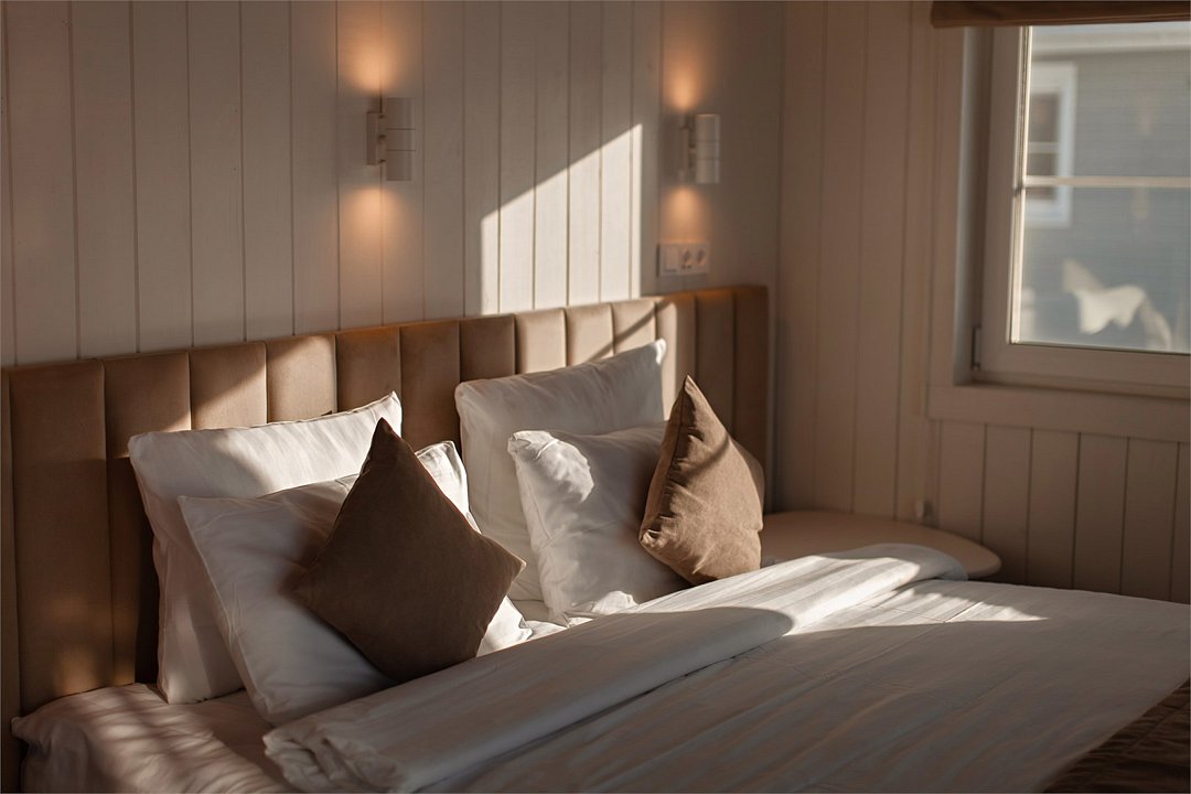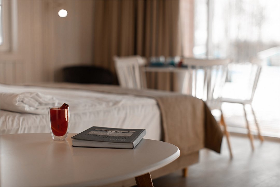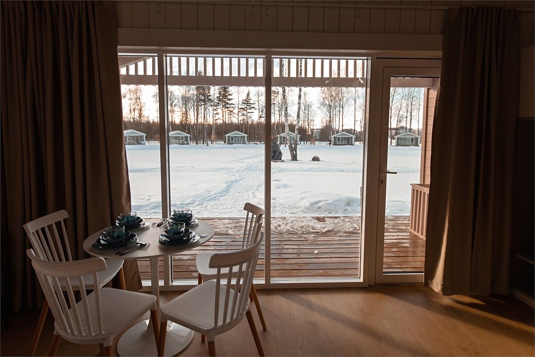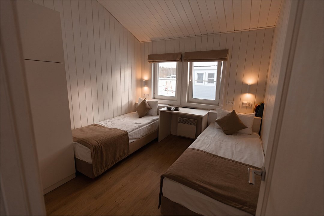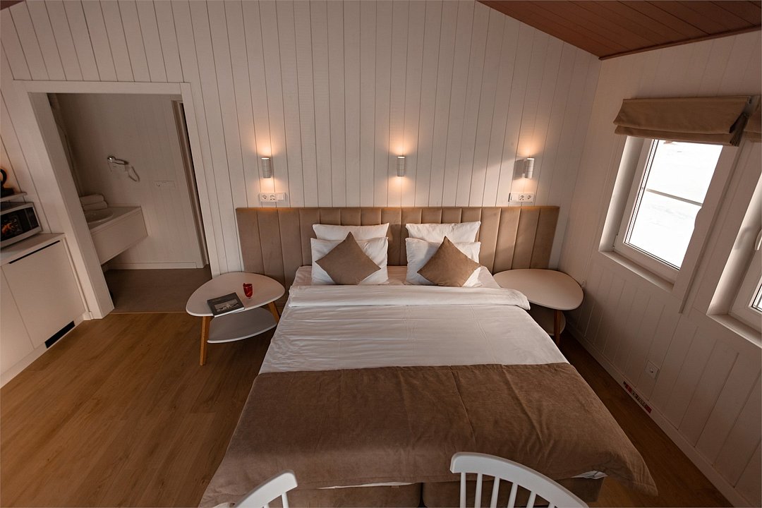 В современных стильных двухкомнатных домах есть полностью оборудованные кухни, что позволяет провести время в кругу семьи или друзей. В каждой из двух комнат уютно разместится по два человека, а пожелания по выбору односпальных или двуспальных кроватей можно указать при бронировании. В каждом доме предусмотрен санузел с современной душевой кабиной, а просторная терраса с видом на озеро и панорамные окна создают атмосферу единения с природой. Здесь вам будет удобно как отдыхать, так и заниматься важными делами — в домах есть рабочие места с достаточным количеством розеток для зарядки гаджетов.