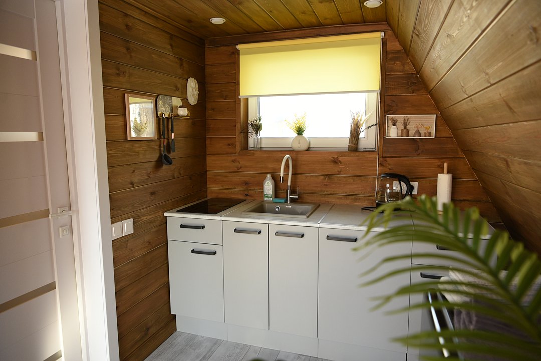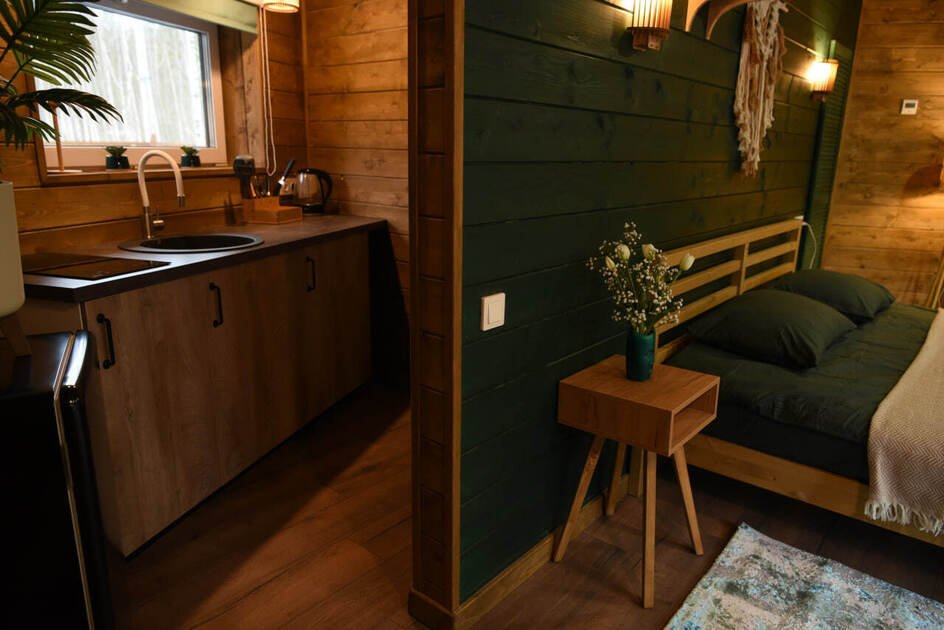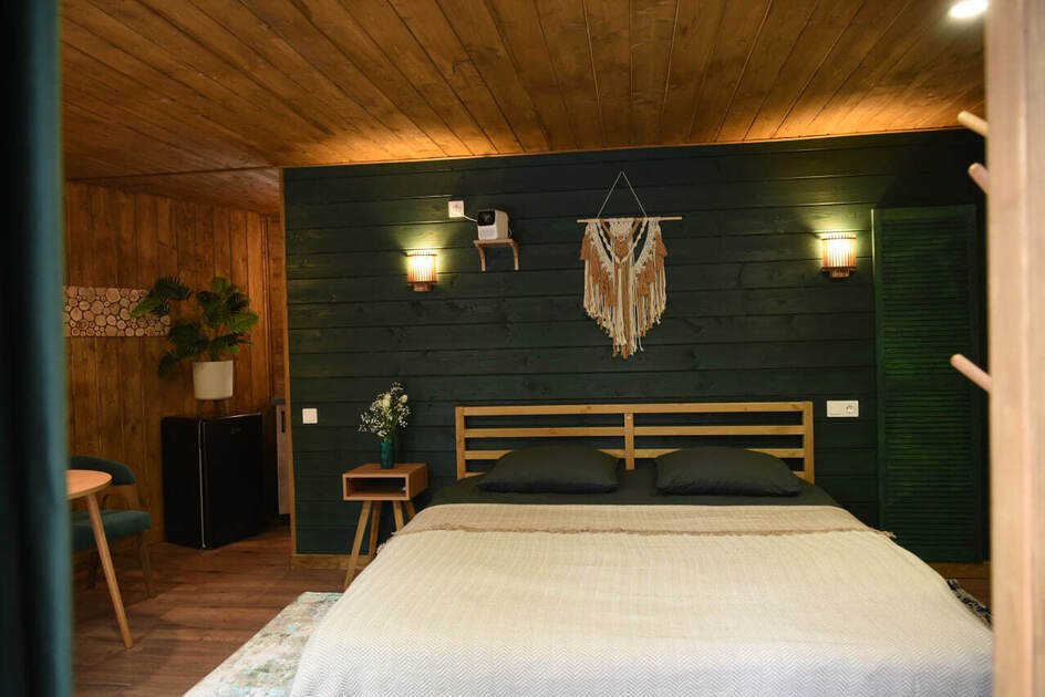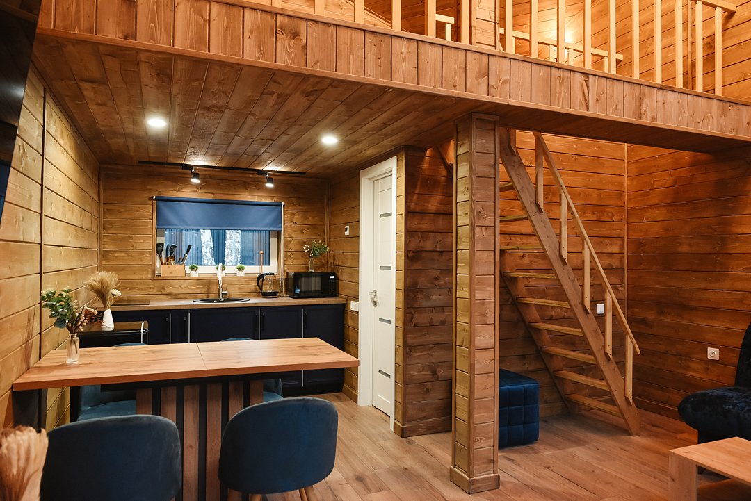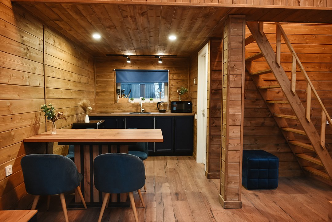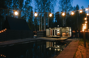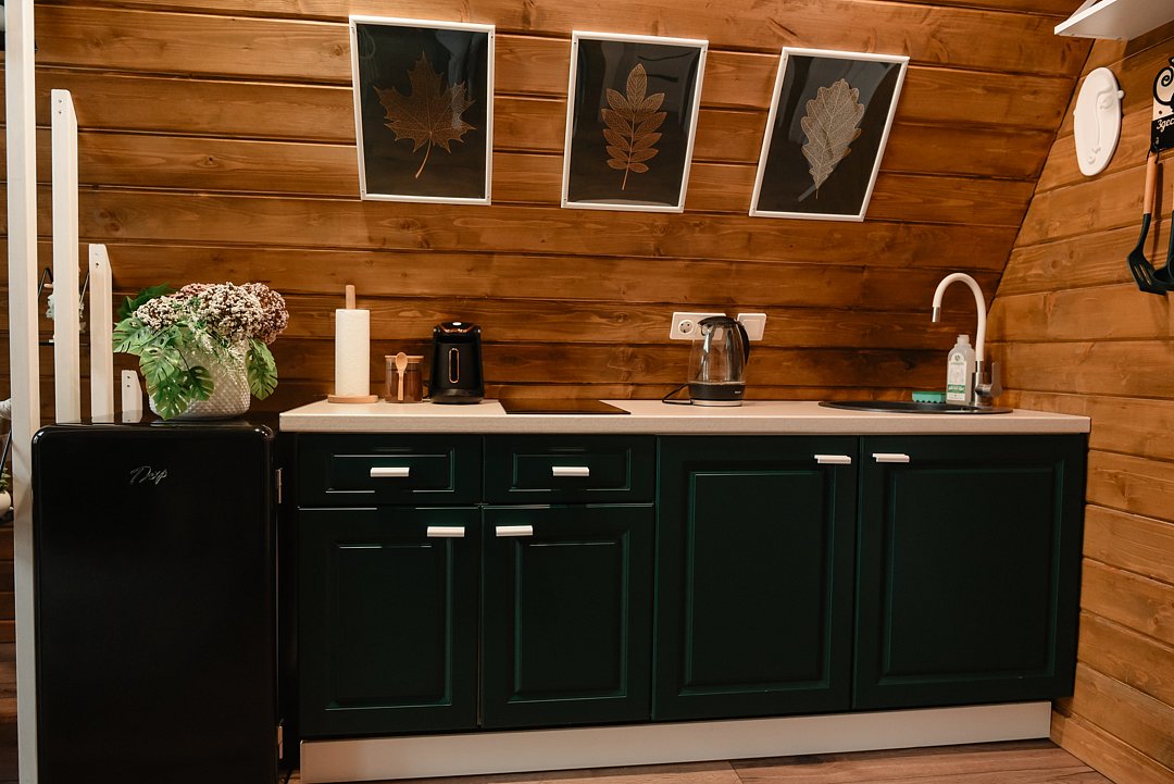 Домики оборудованы всем необходимым для комфортного проживания собственной кухней, набором посуды, чайником, холодильником, санузлом, душем, феном, столом, стульями, Wi-Fi.