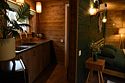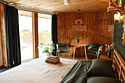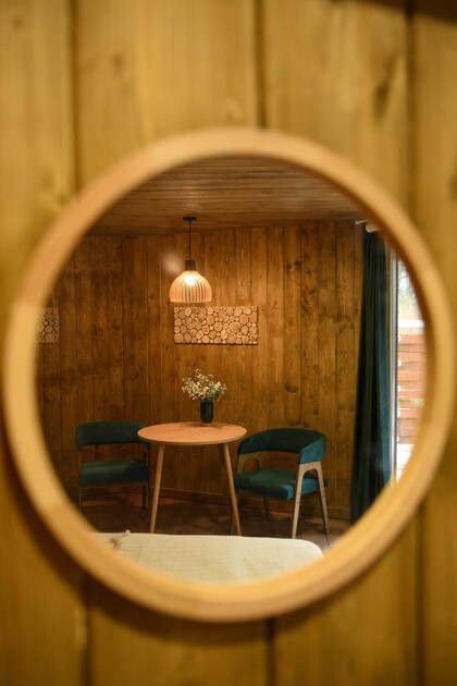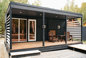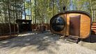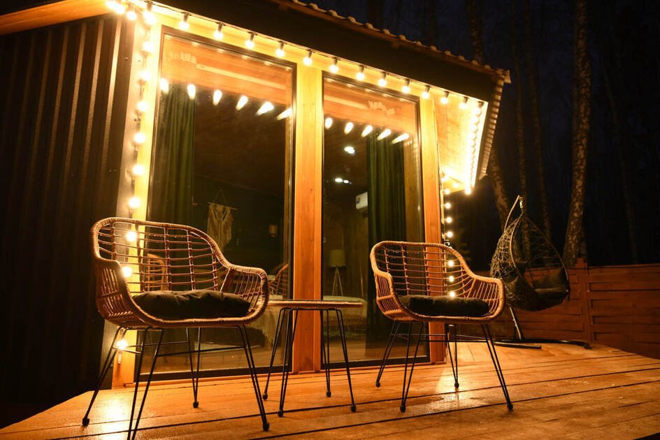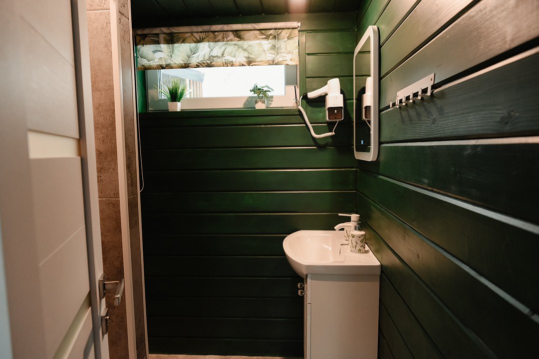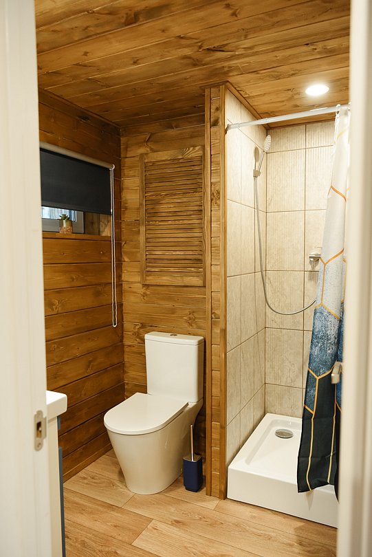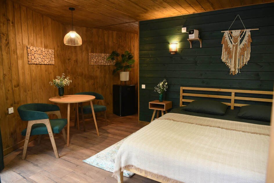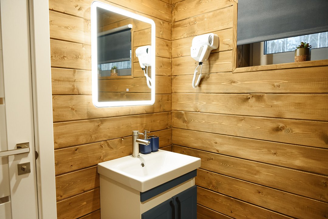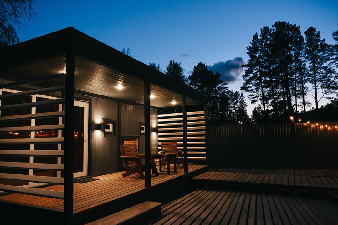 Домики оборудованы всем необходимым для комфортного проживания собственной кухней, набором посуды, чайником, холодильником, санузлом, душем, феном, столом, стульями, Wi-Fi.