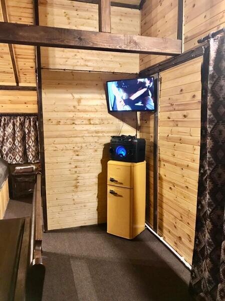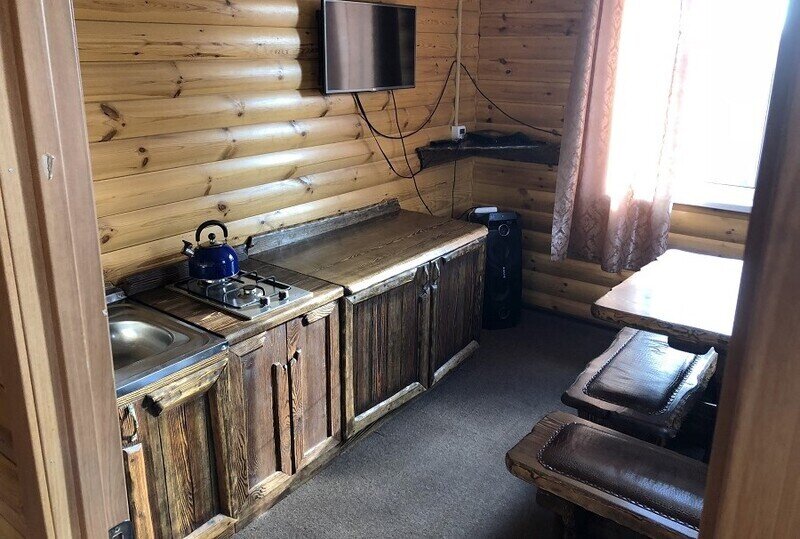 Гостиная на 6 посадочных мест и 2 спальных зоны, сан. узел, душ, (общее количество спальных мест на 4 человека), холодильник, чайник на газовой плите, телевизор, DVD-караоке аппаратура с колонкой, поддерживающей DVD, usb и Bluetooth, оборудованная кухня