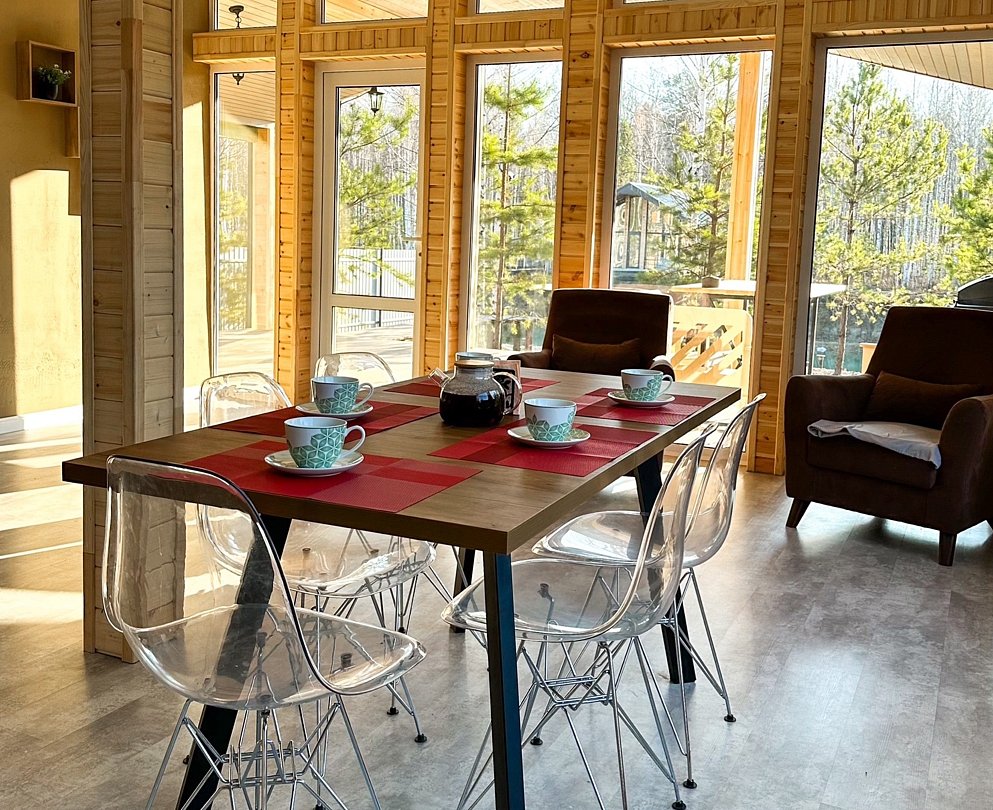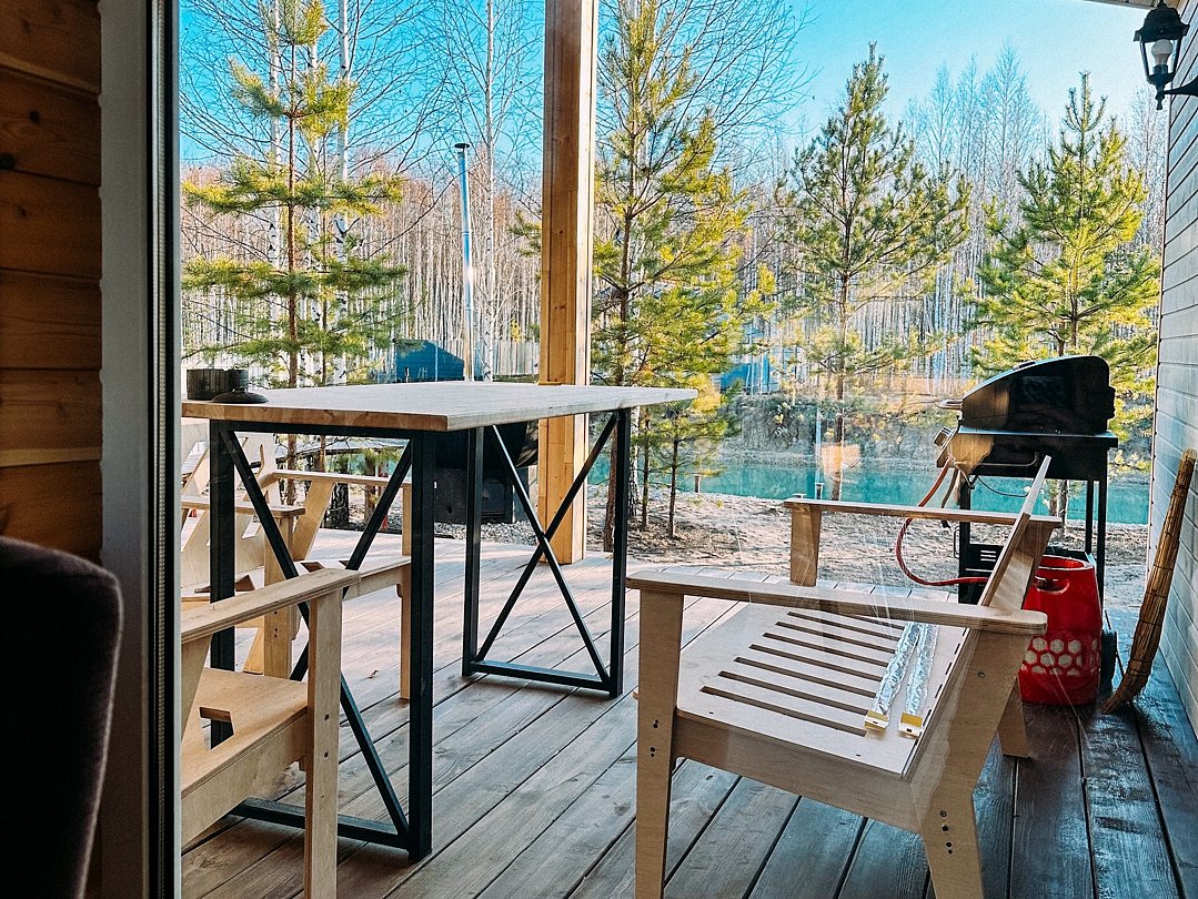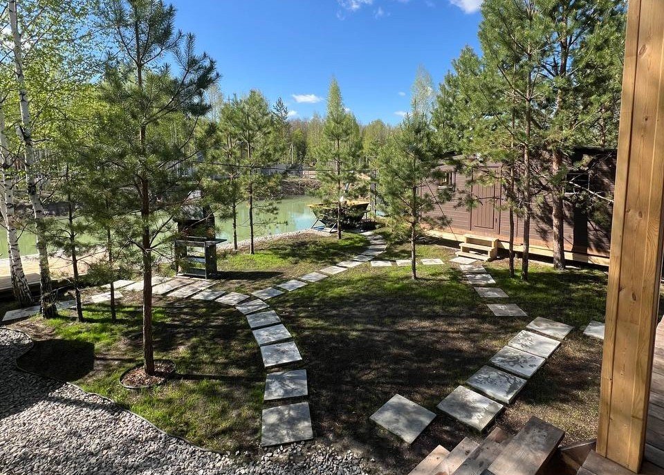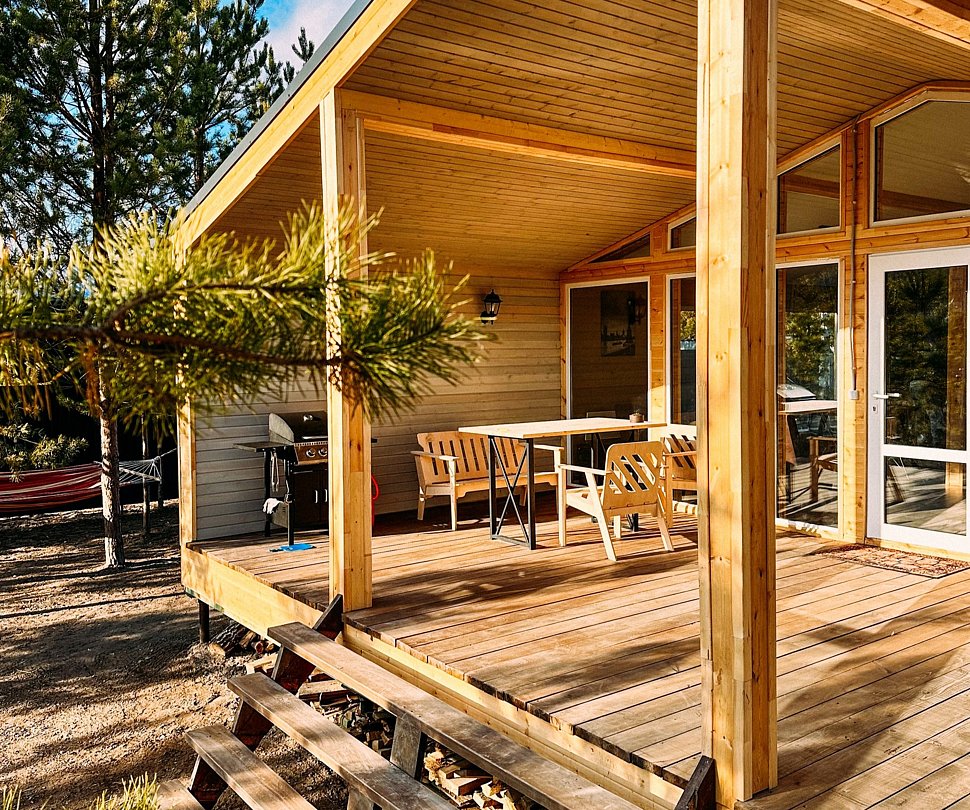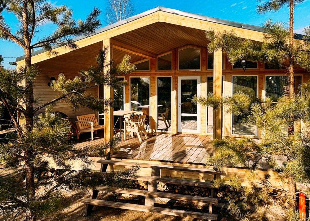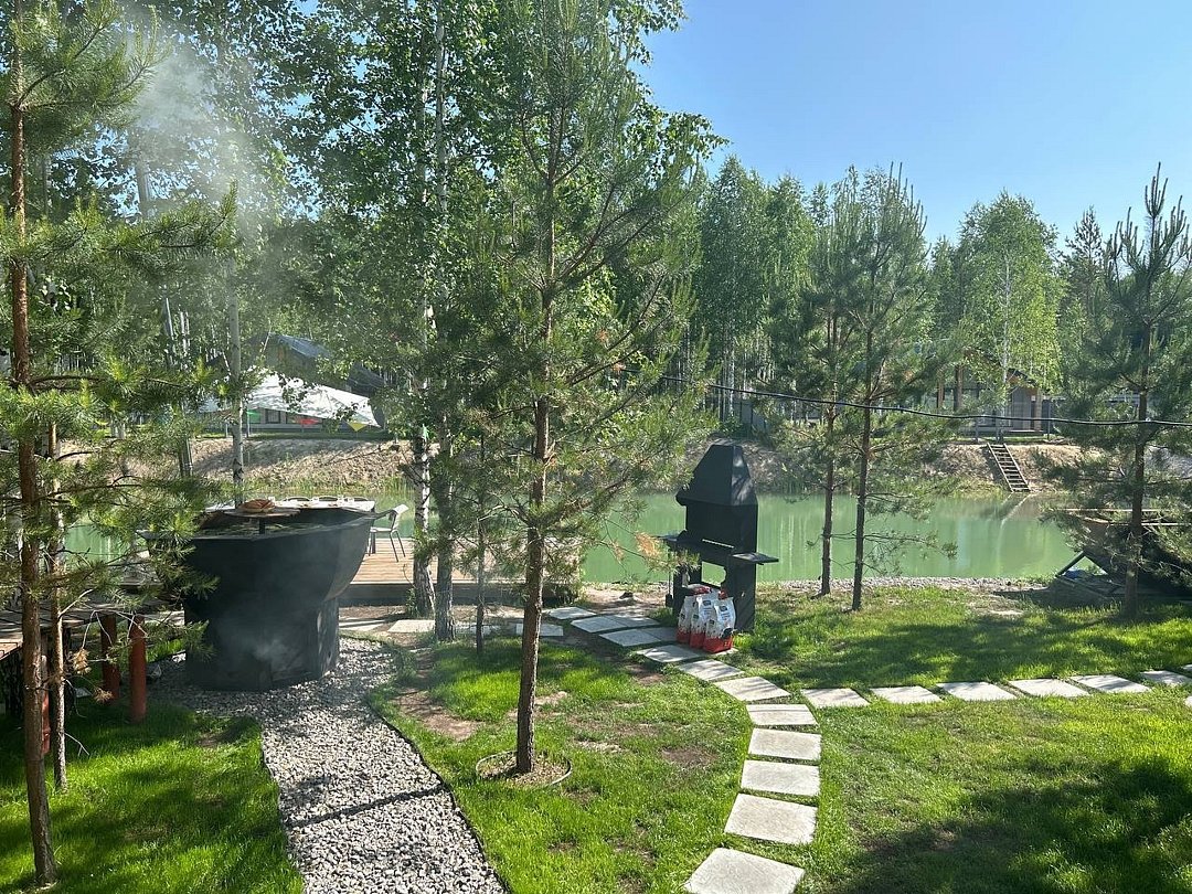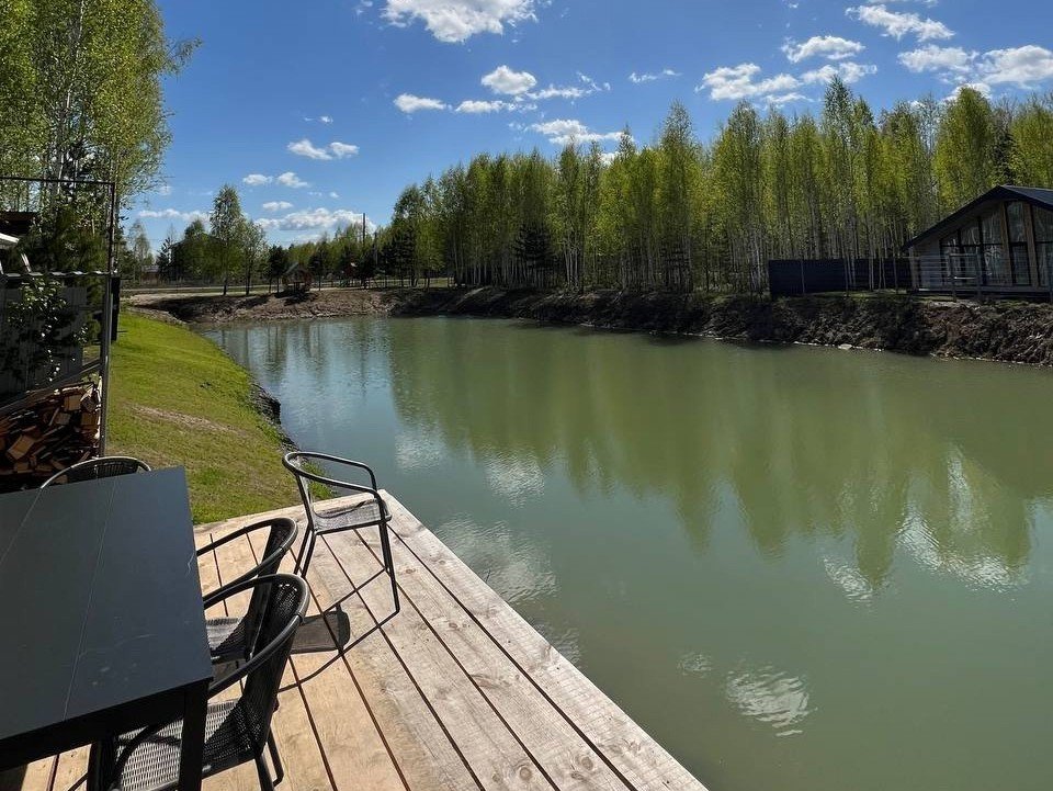 Комплекс раскинулся на закрытой территории на берегу небольшого водоема. Для проживания предлагается одноэтажный 3-комнатный дом в стиле барнхаус, вмещающий до 6 человек. Внутри – современный интерьер, панорамные окна, полноценная кухня, персональный санузел. Оборудовано три спальни с двуспальными кроватями, на кухне имеется вся необходимая посуда и техника, включая духовой шкаф, плиту, полноразмерный холодильник. Установлено два ЖК-телевизора, есть доступ к wi-fi. В обеденной зоне - просторный стол и стулья, на меблированной террасе – газовый гриль.