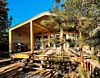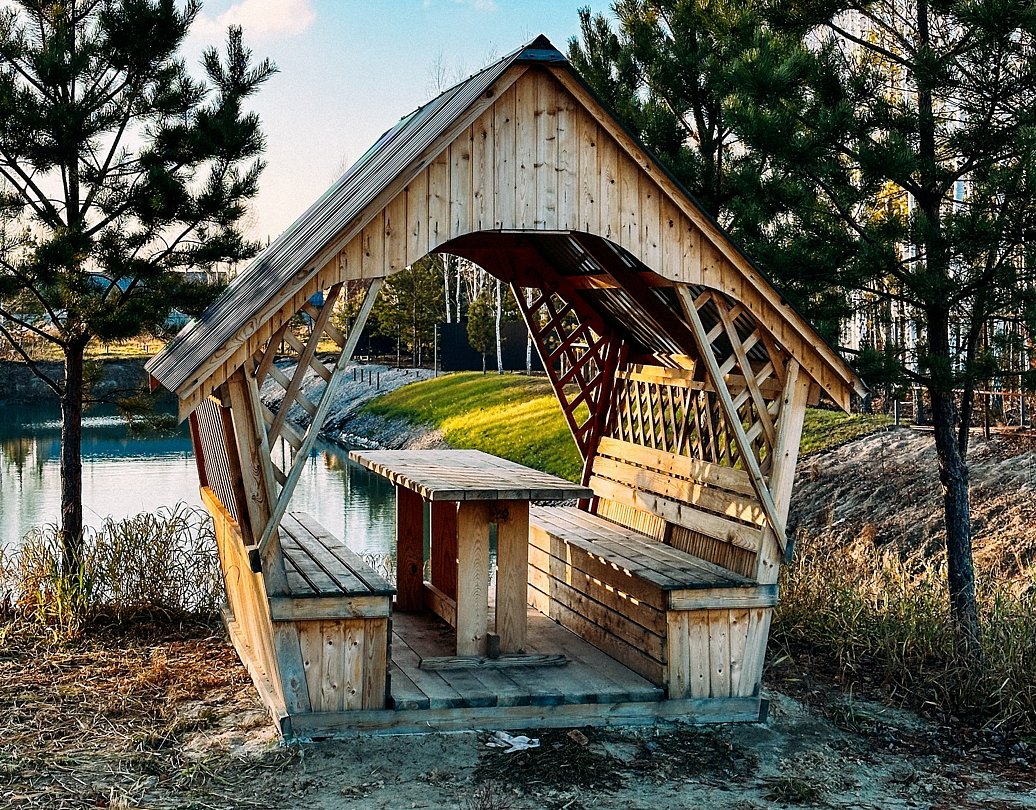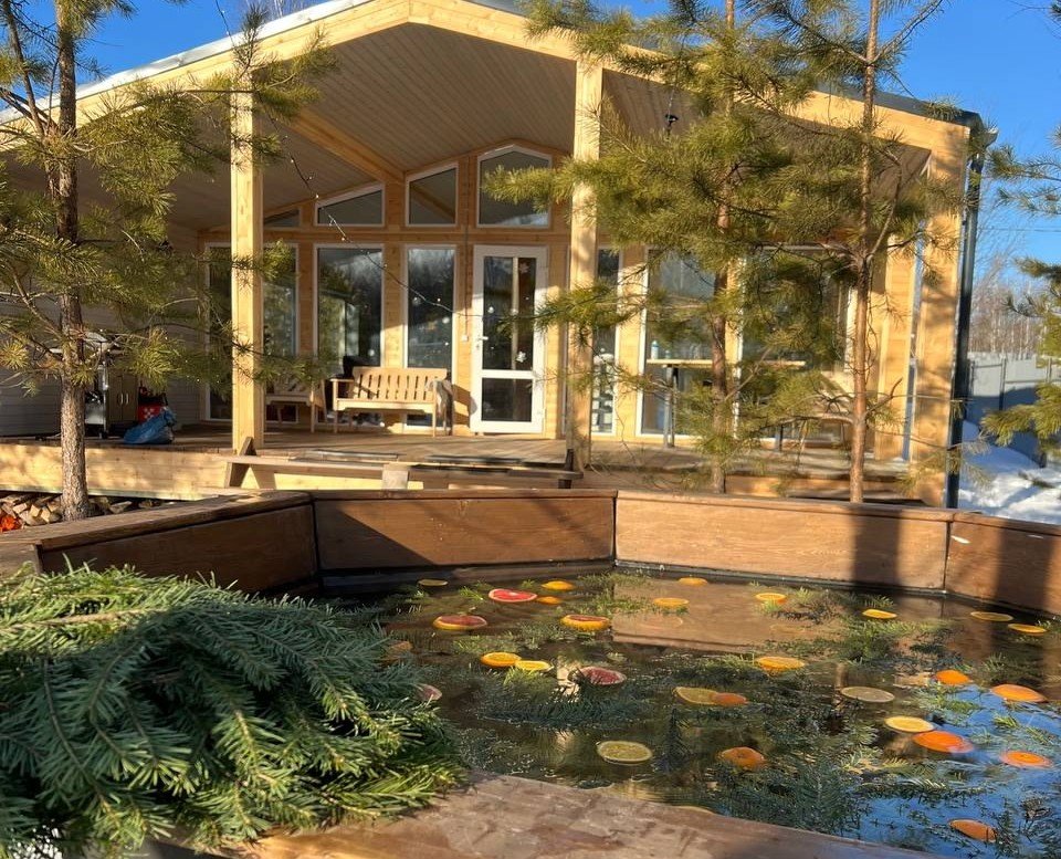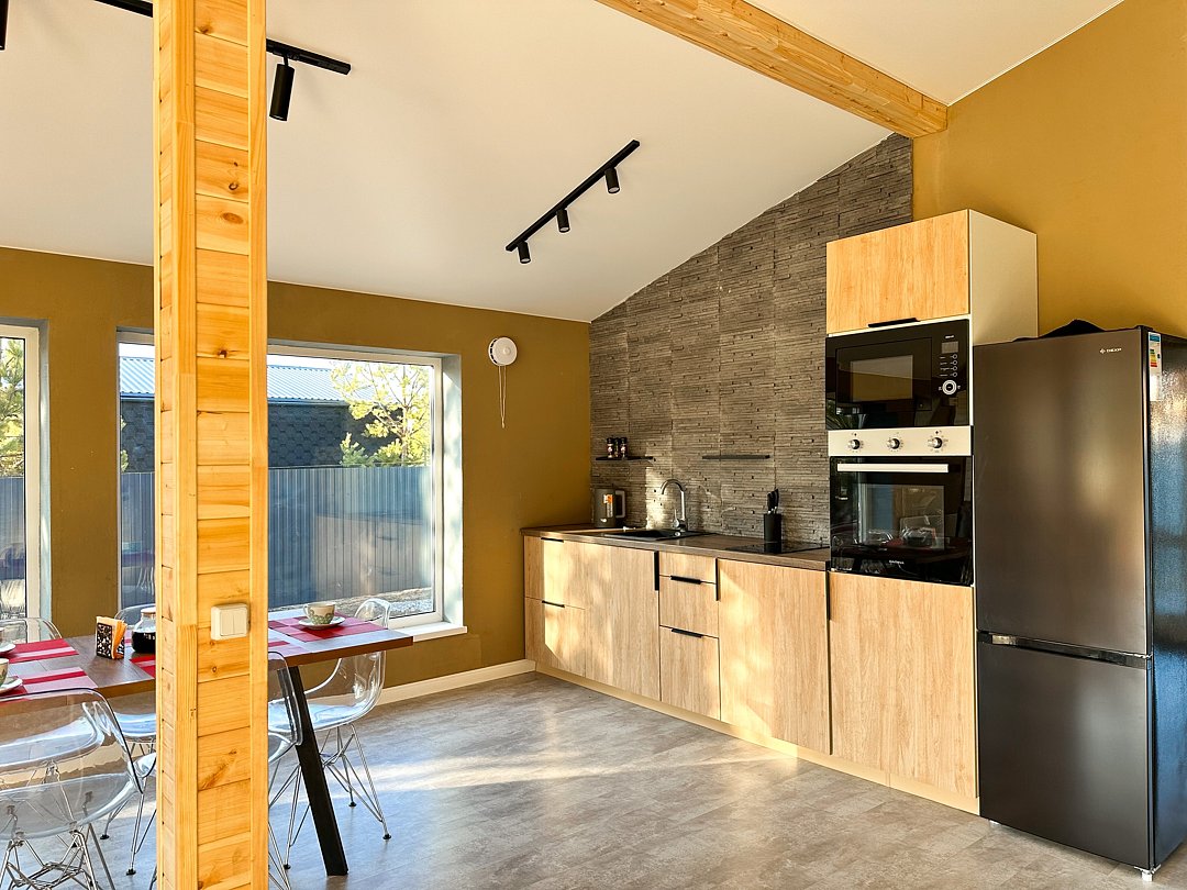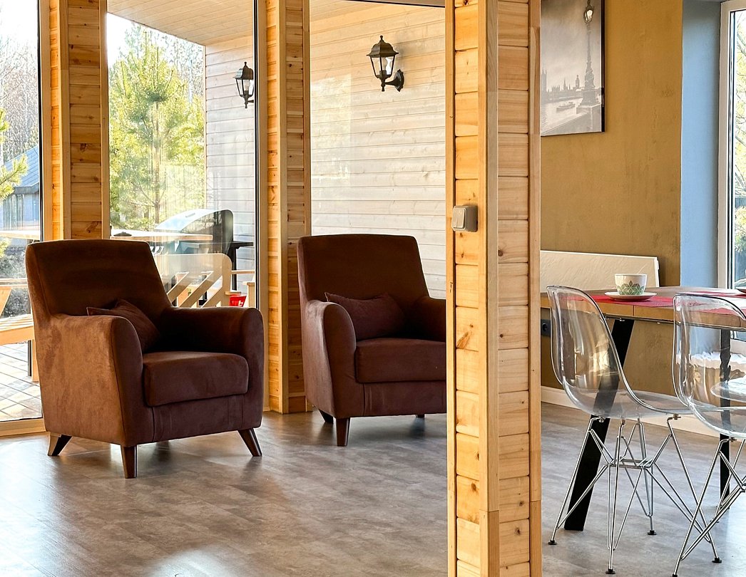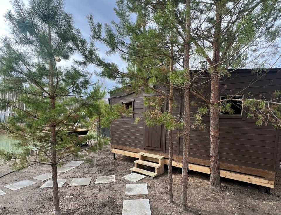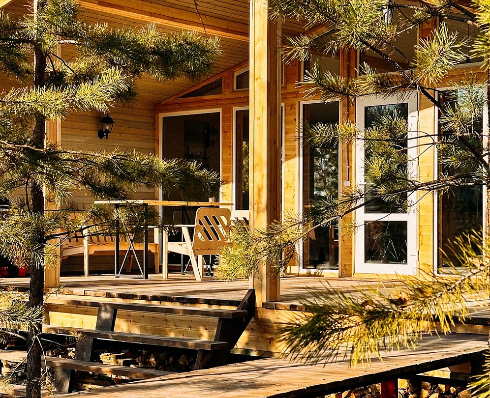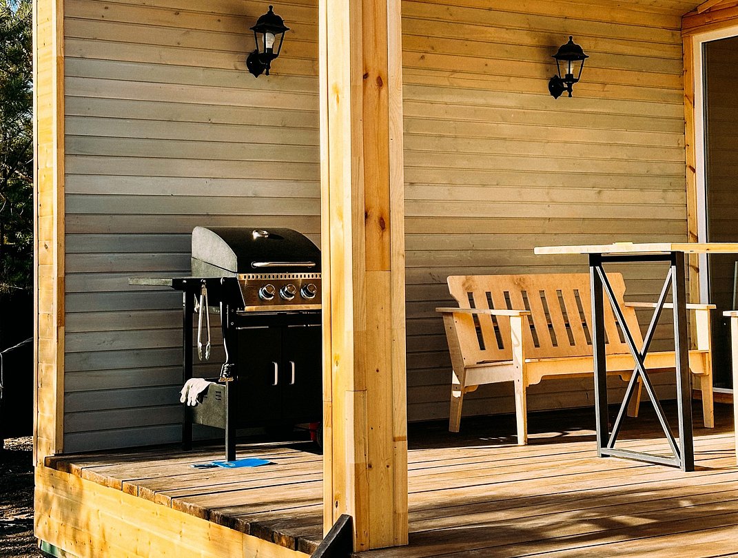 Комплекс раскинулся на закрытой территории на берегу небольшого водоема. Для проживания предлагается одноэтажный 3-комнатный дом в стиле барнхаус, вмещающий до 6 человек. Внутри – современный интерьер, панорамные окна, полноценная кухня, персональный санузел. Оборудовано три спальни с двуспальными кроватями, на кухне имеется вся необходимая посуда и техника, включая духовой шкаф, плиту, полноразмерный холодильник. Установлено два ЖК-телевизора, есть доступ к wi-fi. В обеденной зоне - просторный стол и стулья, на меблированной террасе – газовый гриль.