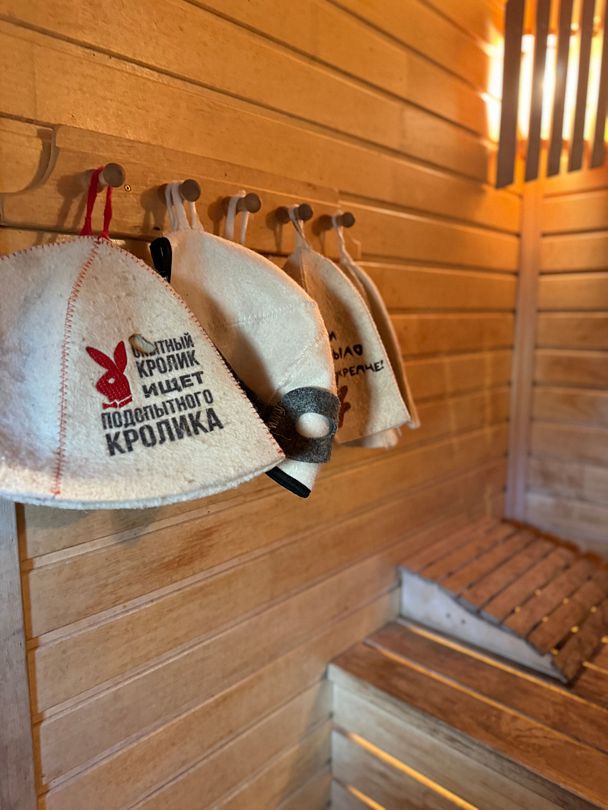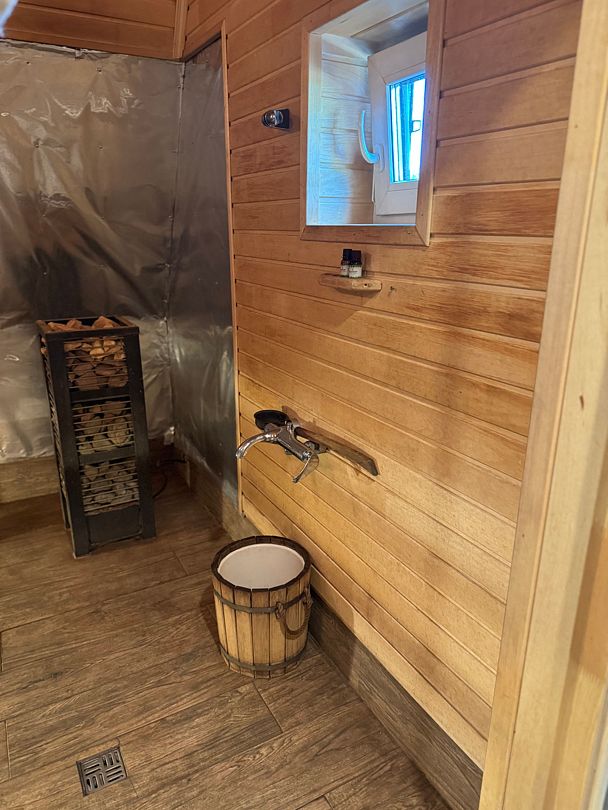 Инфраструктура: полотенца, шапочки, обливное ведроВ сауне современная электропечка, очень удобная в использовании. Не надо колоть дрова, следить за температурой-нажал на кнопочку и все — температура будет держаться, пока Вы пользуетесь сауной.