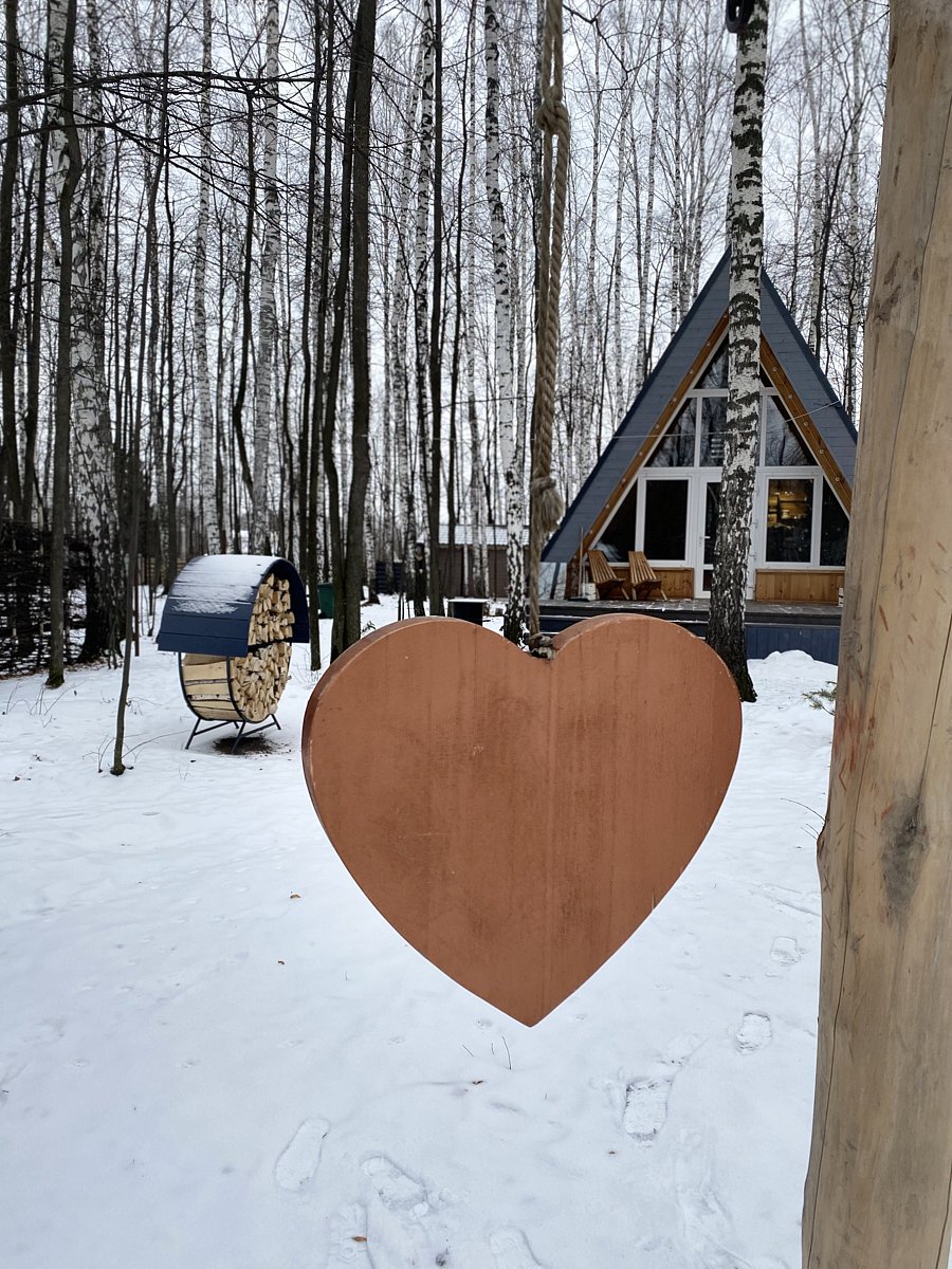 Дом-шалаш имеет два входа, огромное панорамное окно и террасу, на которой расположены уютные кресла-шезлонги. Дом имеет площадь 62 кв.м, 2 комнаты и этаж лофт+. На этаже лофт+ расположена огромная двуспальная кровать с освещением эффекта «парящей кровати». В кухне-гостиной расположена полностью оборудованная кухня с индукционной плитой, духовкой, посудой и принадлежностями для приготовления и для принятия пищи, барный стол, стулья, огромный комфортный диван, уютное кресло-качалка и большой смарт-телевизор для просмотра любимых фильмов и каналов. Ванная комната оборудована душевой кабиной, унитазом с функцией биде, зеркалом с сенсорной подсветкой, шкафчиком с фенами и гигиеническими принадлежностями. Зимой в доме тепло и уютно за счет теплых полов и дополнительных обогревателей, а летом не жарко даже в самые знойные дни благодаря плотной кроне деревьев и правильной технологии постройки деревянного дома.