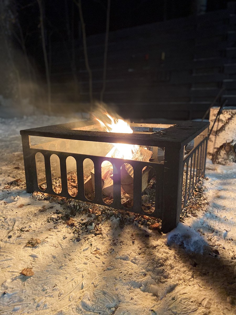 В ванной комнате есть также все необходимое для комфортного принятия гигиенических процедур. Возле дома расположен костровая чаша с искрогасителем и функцией мангала и удобные кресла-шезлонги для долгих и неспешных разговоров у огня