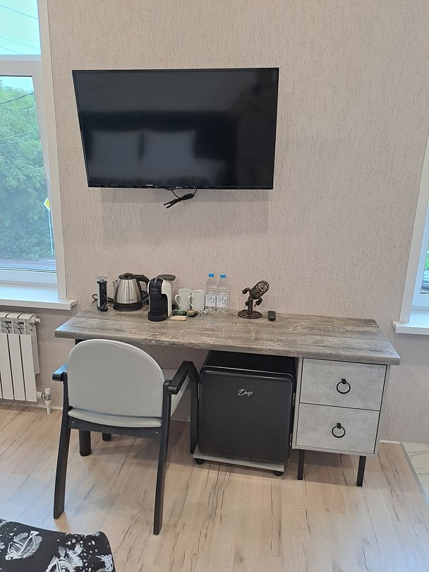 Рабочее место, кресло, кондиционер, современный телевизор, бесплатный Wi-Fi, холодильник, набор для чая. В ванной комнате: душевая кабина, санузел, умывальник, фен, комплект полотенец, тапочки, косметические принадлежности.