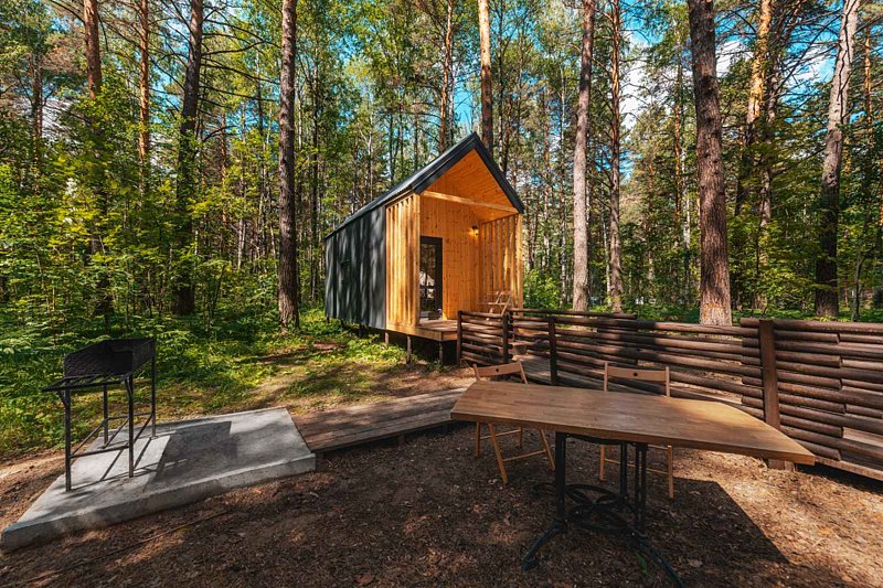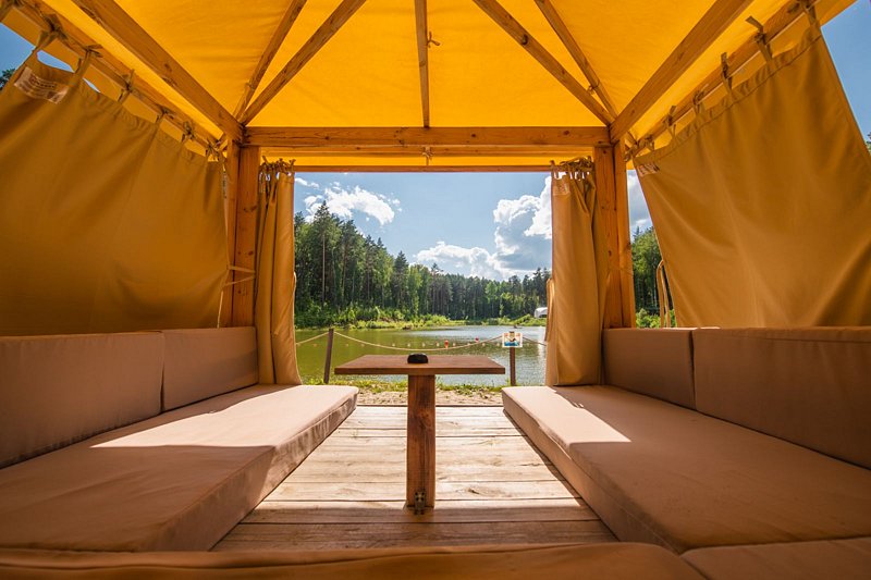 На базе отдыха расположено пять уютных деревянных беседок, открывающих великолепный вид на озеро и лес. Каждая беседка вмещает до 12 человек, что делает их идеальным местом для празднования семейных торжеств или корпоративных мероприятий.