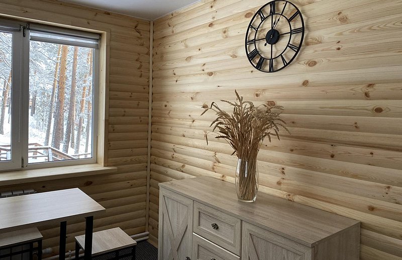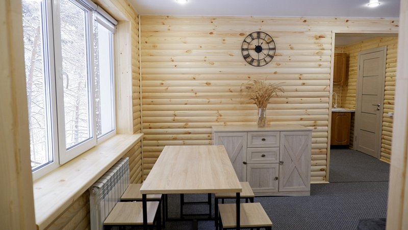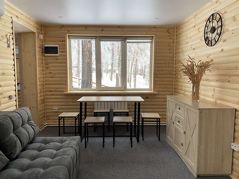 Баня оформлена в классическом русском стиле из натурального дерева, создавая уютную атмосферу. Баня вмещает от 6 до 8 человек, что предоставляет отличную возможность провести время в компании близких друзей или семьи. В наличии ведра с холодной водой, веники (приобретаются у администратора), полотенца, душевые и санузлы.