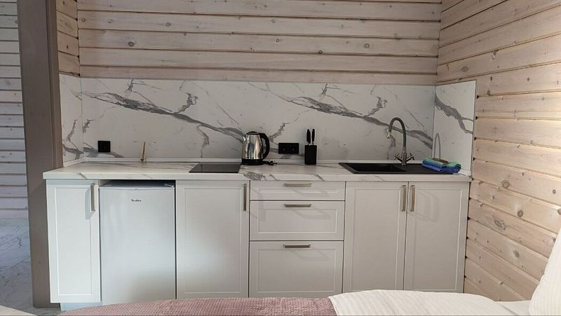 В доме есть все необходимое: система отопления, телевизор с интернет каналами, двуспальная кровать, комфортный диван, уютные пледы, санузел, душевая с косметикой и феном, кухня со столовыми приборами, плитой и микроволновой печью, бесплатный Wi-Fi, терраса с мангалом и уличной мебелью для завтраков под теплыми лучами солнца и отдыха под открытым небом.