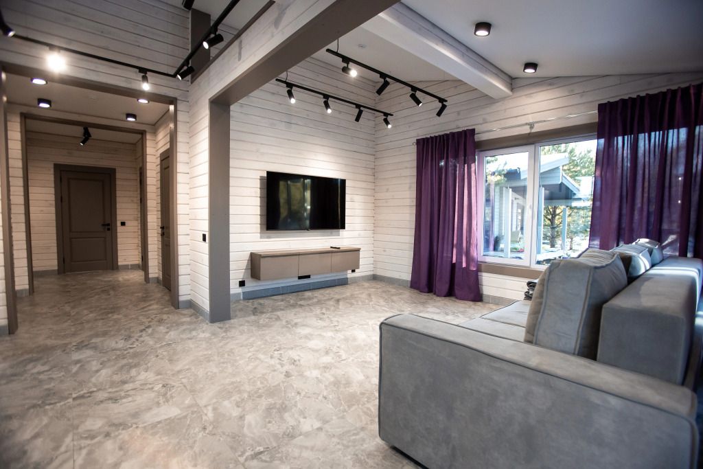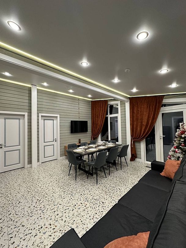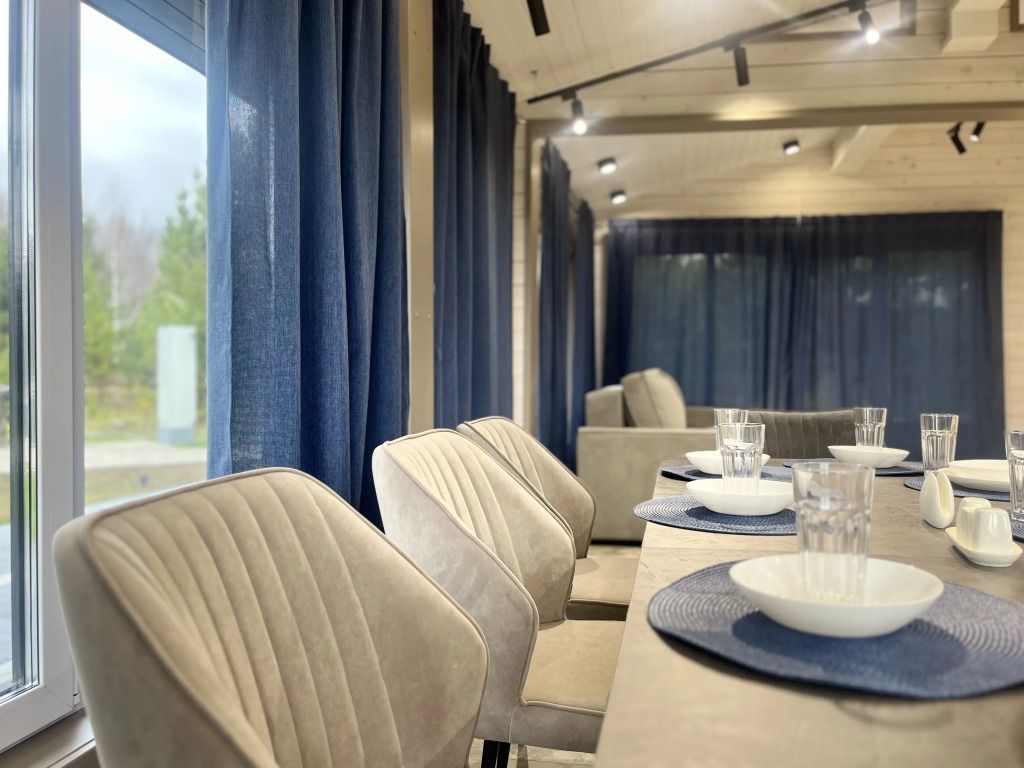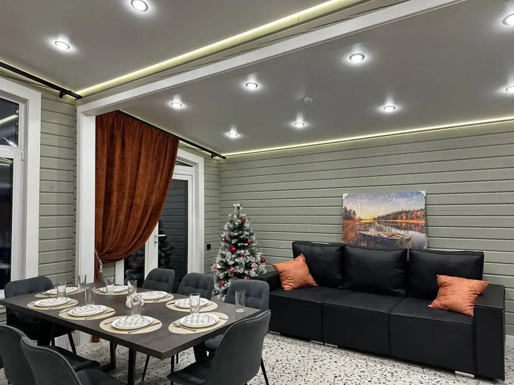 Уютный, комфортабельный дом с панорамными окнами, открывающими захватывающий вид на зимний лес. В доме вас ждет атмосферная, залитая светом кухня-гостиная, где можно наслаждаться каждым моментом, чувствуя полное единение с природой и уединение в лесной тиши.