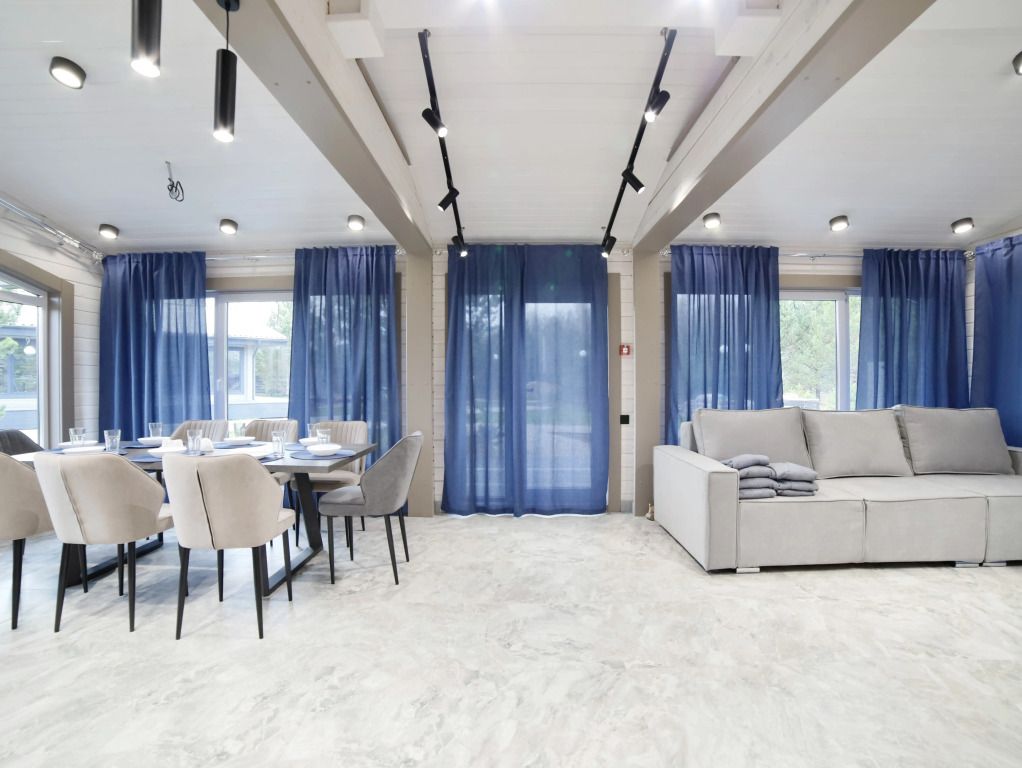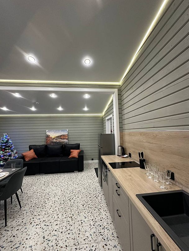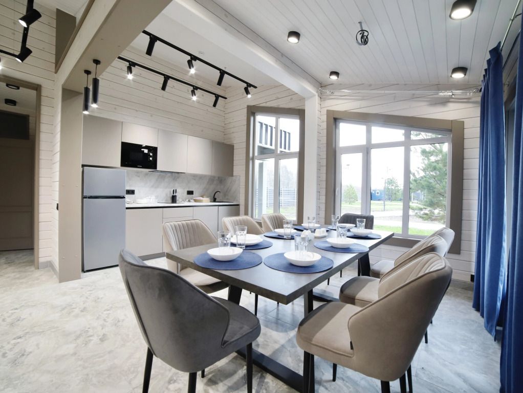 Панорамные окна, атмосферная светлая кухня-гостиная с панорамным видом позволит наслаждаться полным ощущением уединения в лесу.