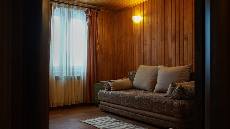 На втором этаже две комнаты, в первой два дивана и балкон, во второй двуспальная кровать, телевизор и комод. На этаже есть санузел