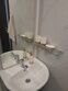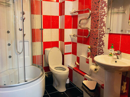 Санузел: полотенца, душевая кабина, туалет, раковина.