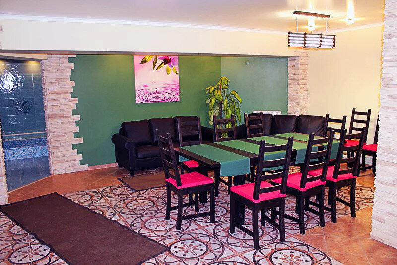 Сауна работает круглосуточно. На кухне есть посуда, чайник, холодильник, микроволновка. Для гостей большой стол, два мягких дивана. И конечно сауна и бассейн.
