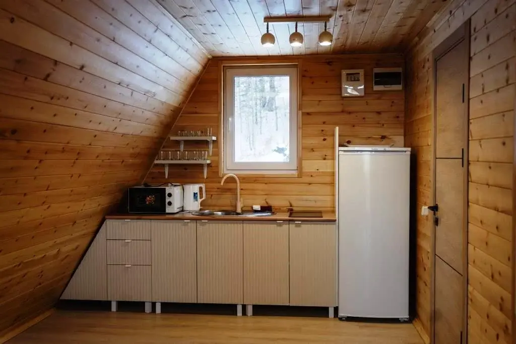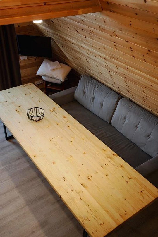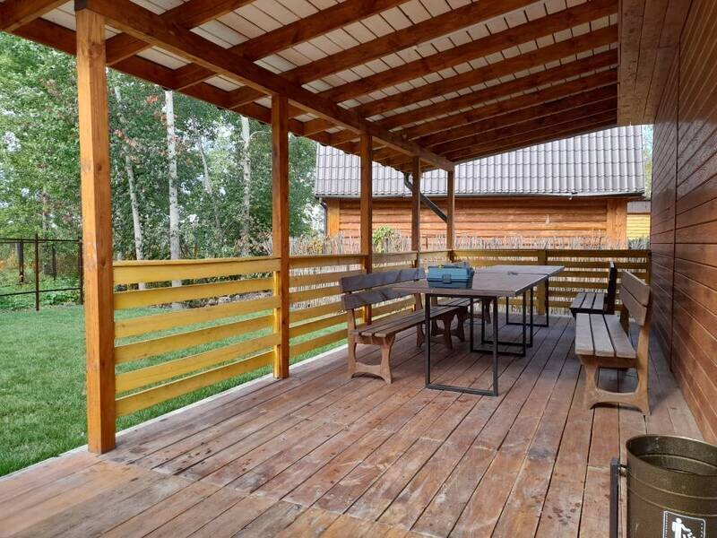 В доме есть всё необходимое: большой стол, бытовая техника, два дивана, чердачная спальня с двуспальной кроватью, телевизор, посуда, санузел, душ.