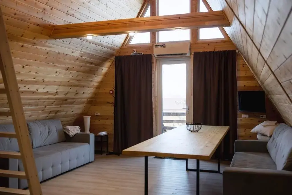 Двухэтажный коттедж. На первом этаже располагается зал с двумя диванами, санузел и сауна.