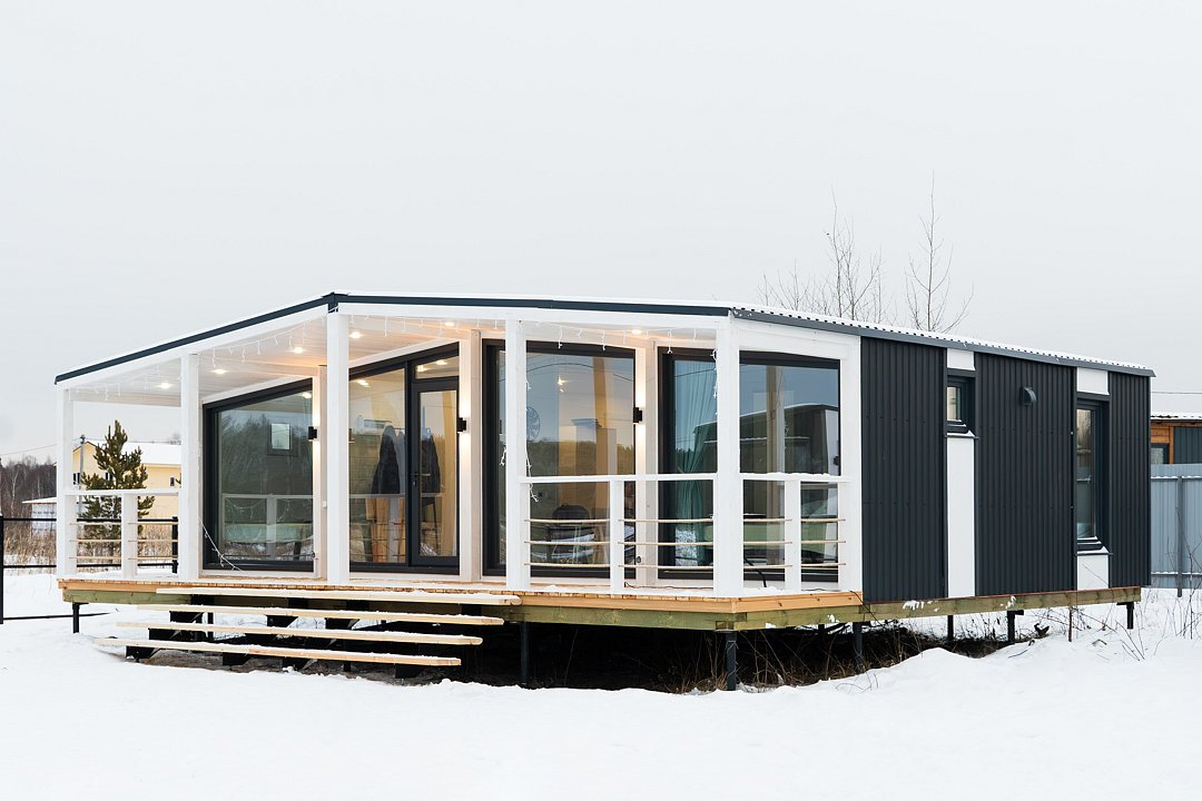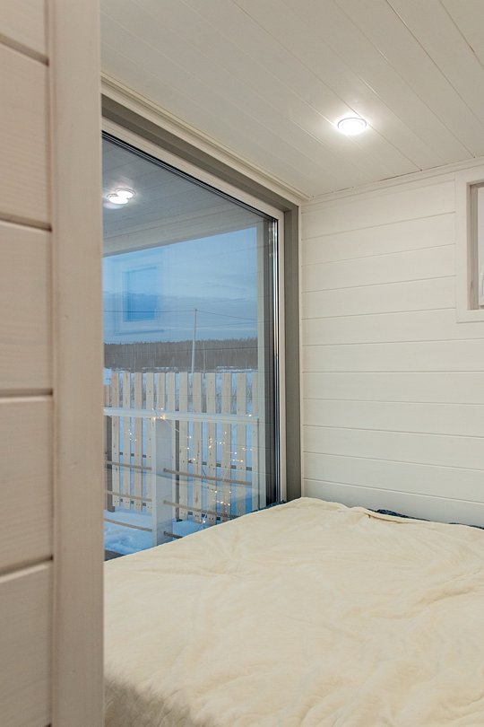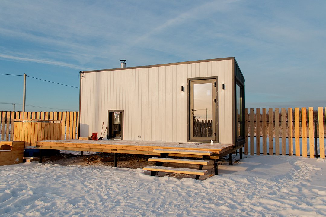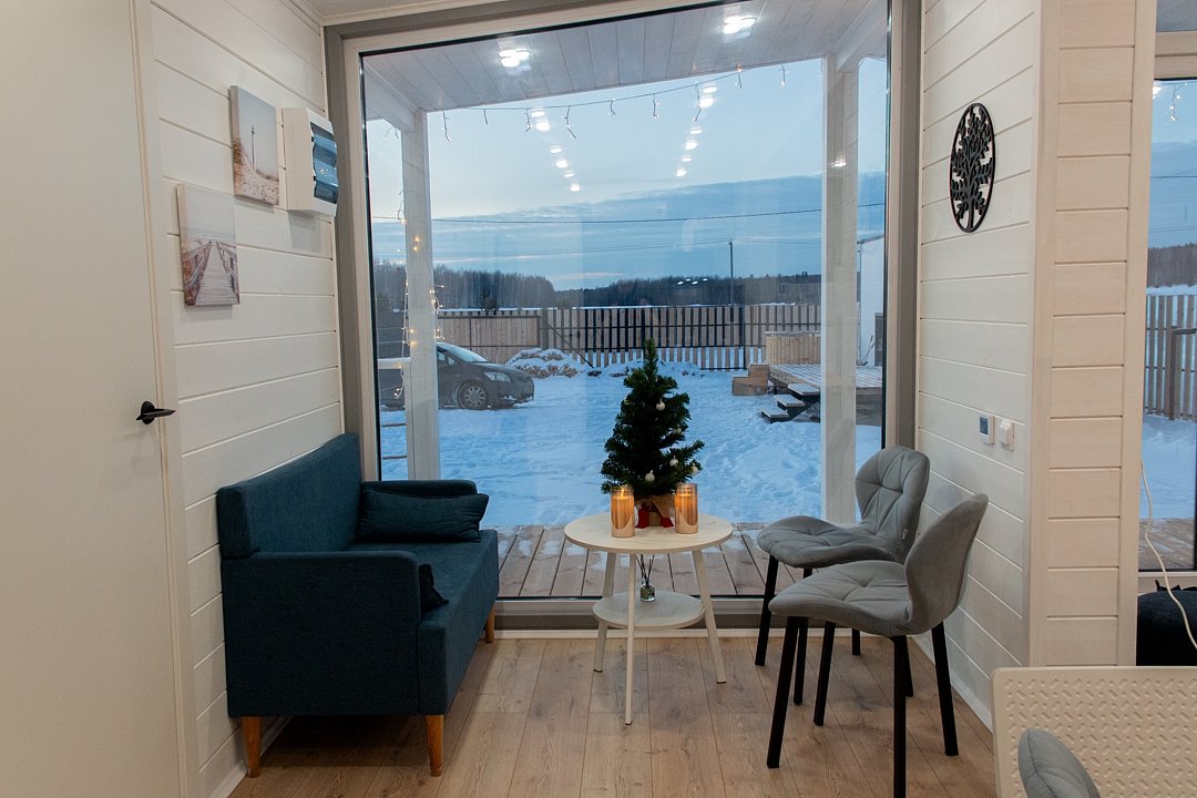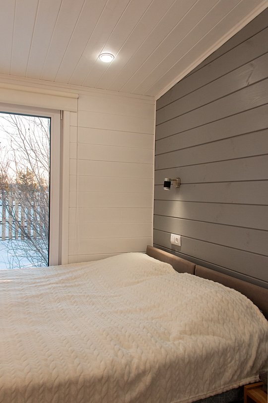 В доме имеются 4 изолированные спальни, кухня-гостиная и санузел с душевой кабиной. Теплый пол проходит по всем помещениям. Дом вмещает до 8 гостей. Три двуспальные и две односпальные кровати. Возможно размещение на раскладушках на дополнительных местах.