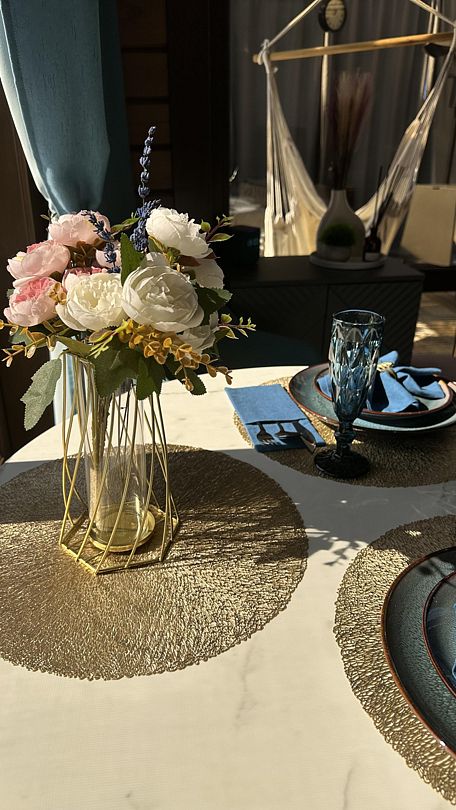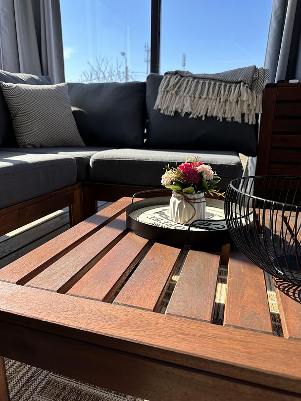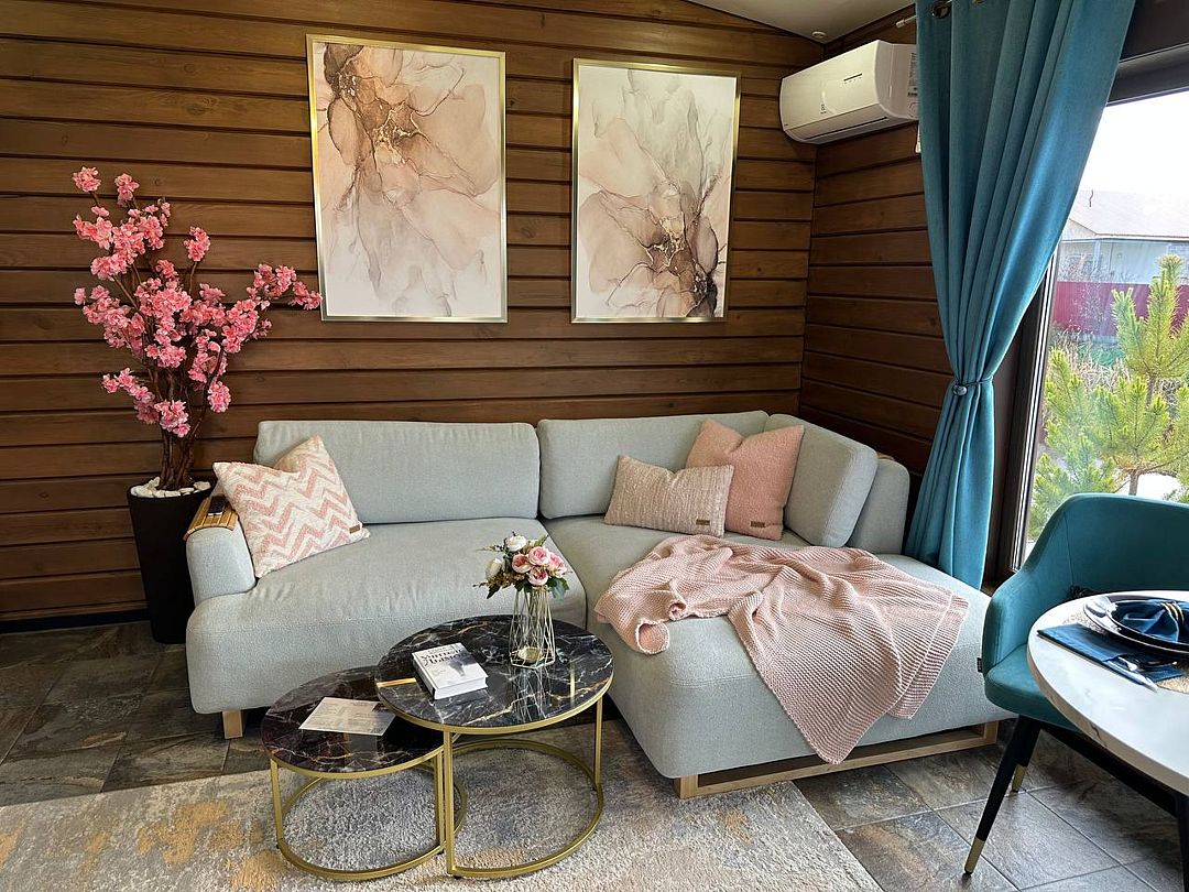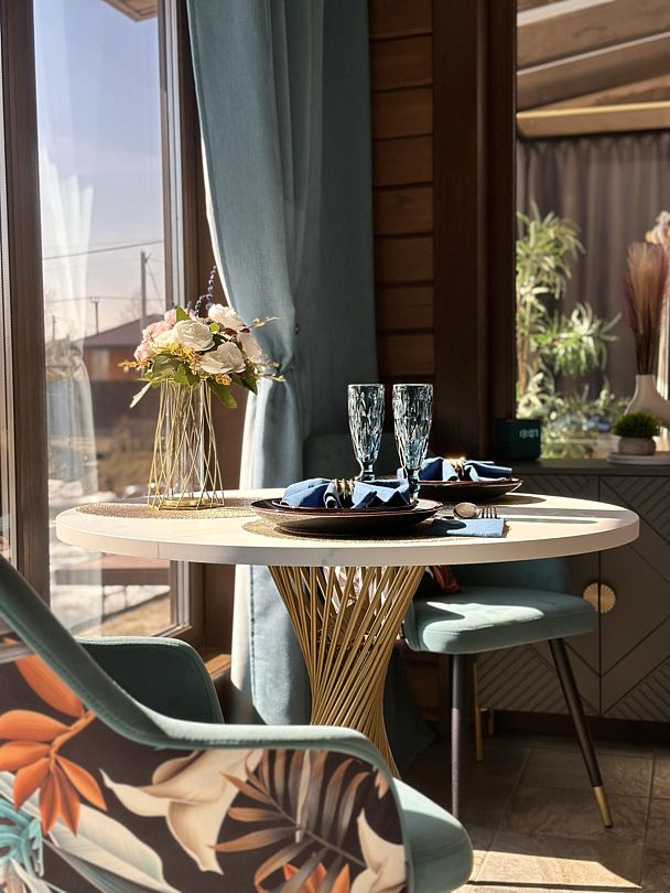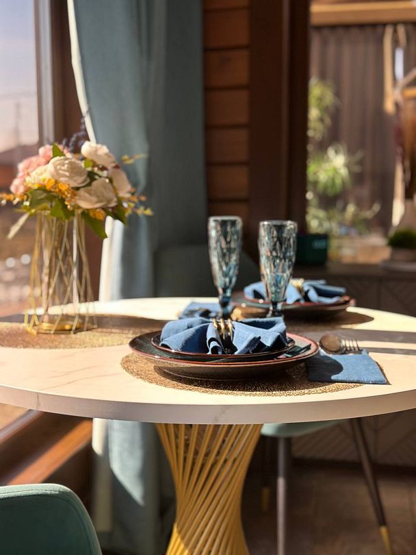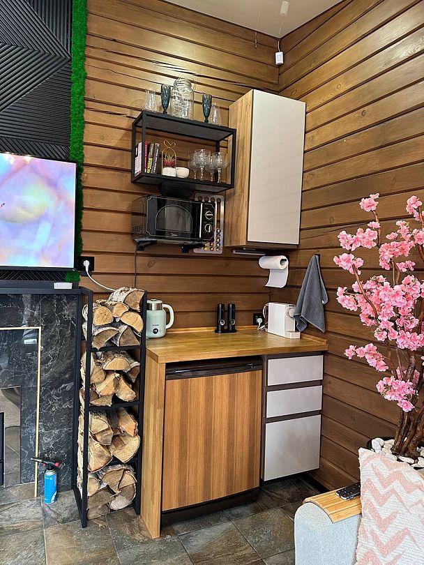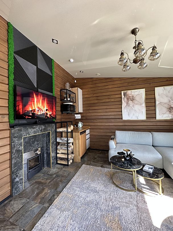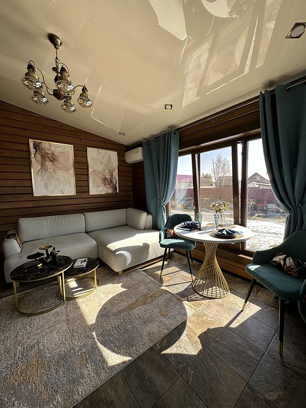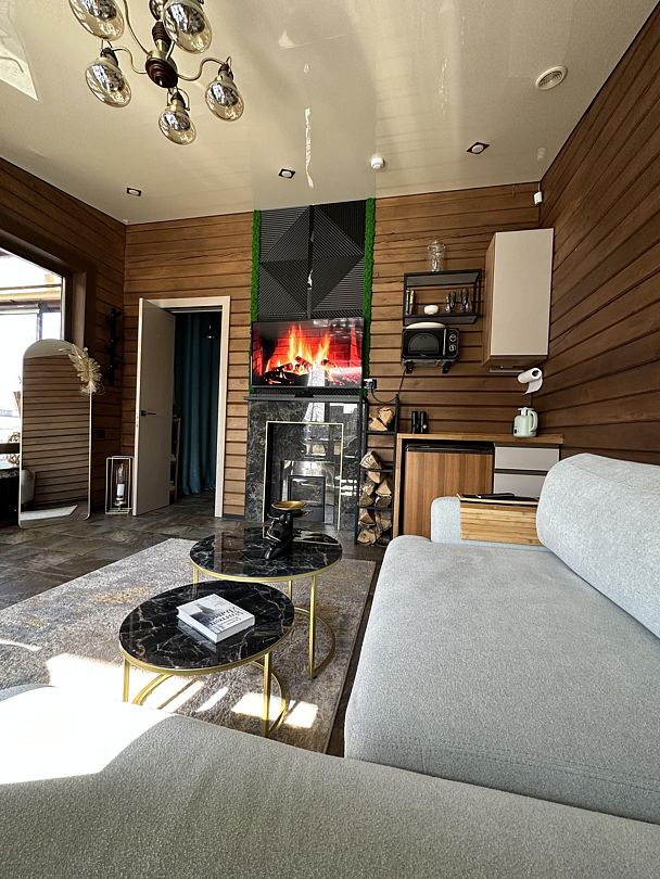 Внутри вас ждет комфортная комната с раскладным диваном и теплым полом, а также современная кухня, полностью оборудованная всем необходимым для приготовления вкусных блюд. Обеденная зона у окна наполнена естественным светом и предлагает вам наслаждаться панорамными видами во время трапезы.