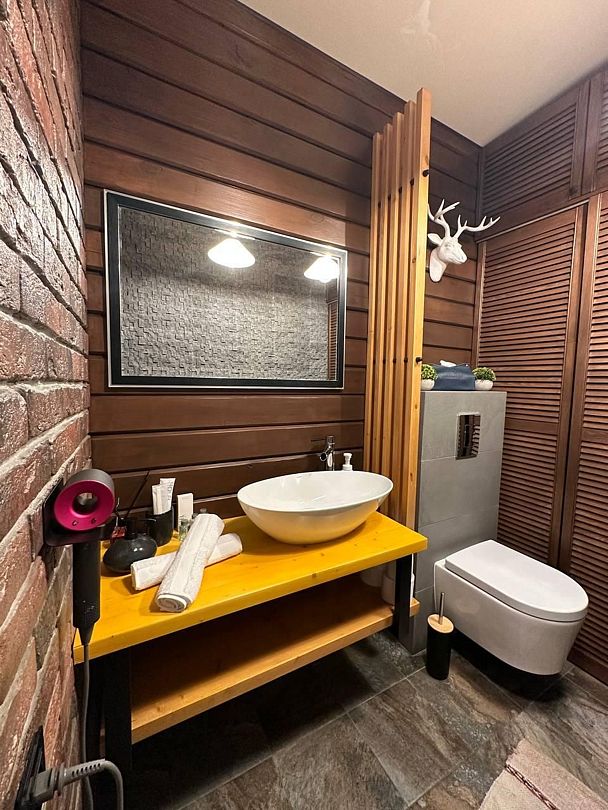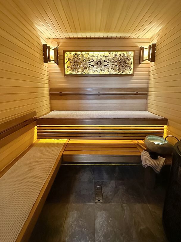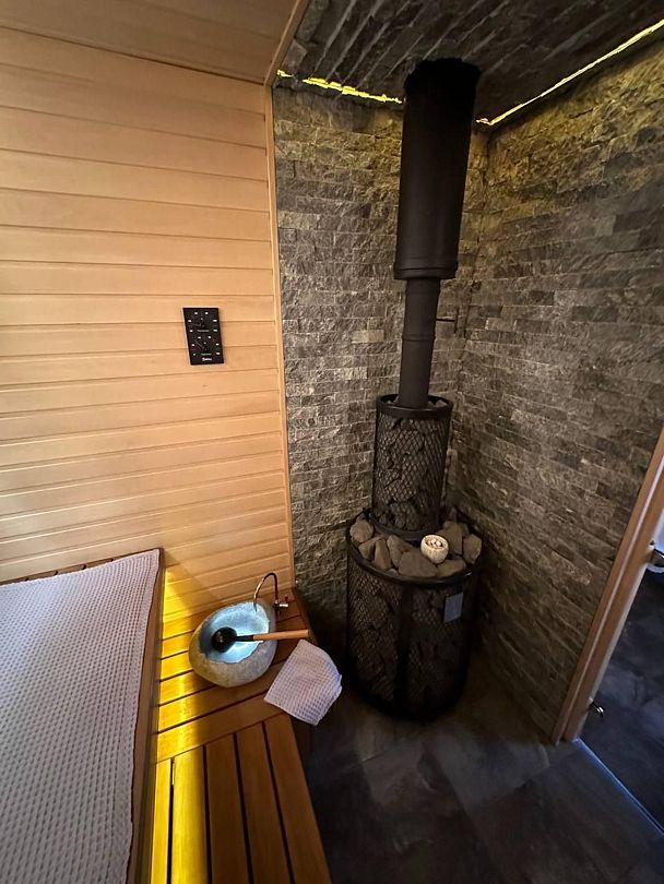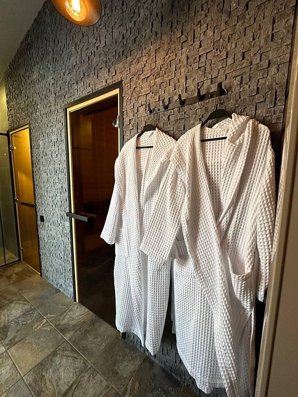 Читать полностьюГостей встречает уютная русская баня, выполненная на дровах и расположенная прямо в доме, которая окутает вас атмосферой традиционного русского отдыха. Здесь можно насладиться паром в окружении каменной печи и можжевеловых панно, а также воспользоваться всеми необходимыми атрибутами для полного погружения в банную культуру — от шайки для запаривания веника до парозахвата и веера.
